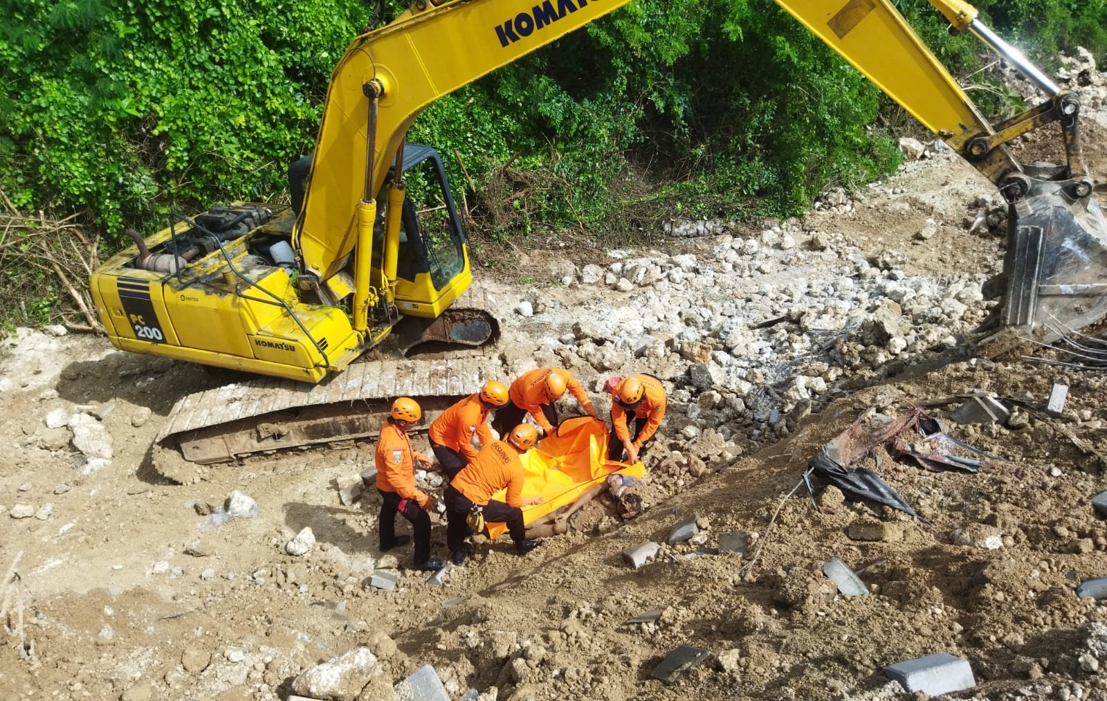 Namun, kondisi di sekitaran longsoran masih labil, terlihat beberapa retakan. Dengan pertimbangan keselamatan dikerahkan peralatan berat. Meskipun peralatan berat beroperasi tetap dalam pengawasan dari tim rescue.