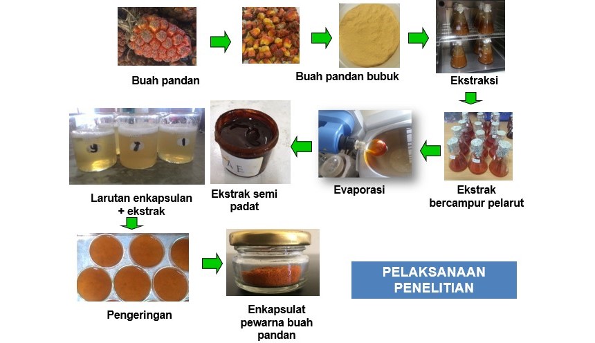 Mengenai proses pembuatan pewarna alami dari buah pandan cukup sederhana. Proses pembuatan pewarna buah pandan dimulai dari proses pengeringan dan pembuatan bubuk buah pandan, proses ekstraksi sehingga didapatkan pewarna yang berbentuk semi padat (pasta) dan dilanjutkan dengan proses enkapsulasi sehingga didapatkan pewarna padat berupa bubuk dari buah pandan.