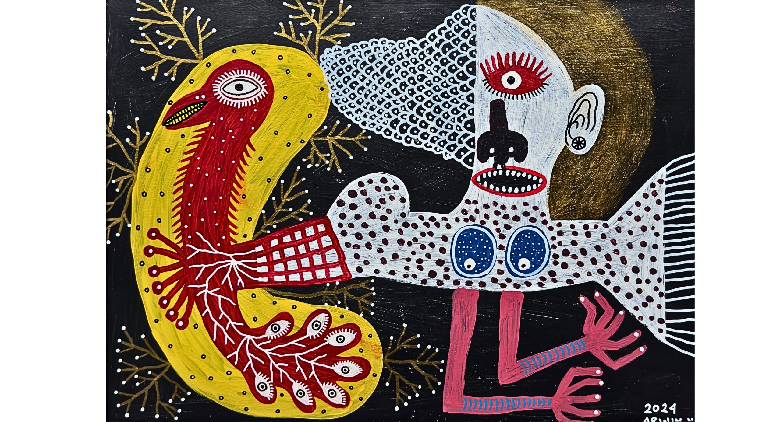 Menggemakan kebinatangan dari makhluk-makhluk Made Kaek. Portofolio Arwin Hidayat yang luas, dari lukisan dan keramik hingga tekstil batik dan mural, menerjemahkan bahasa visual ini ke berbagai media.