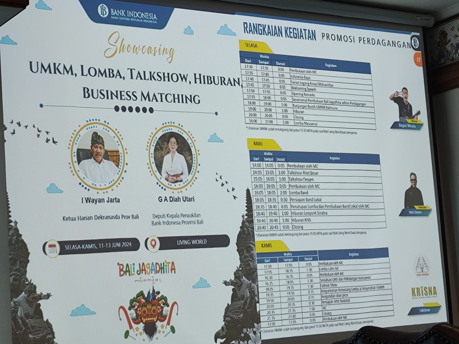 Acara Business Matching dan Site Visit Bali Jagadhita Investment Forum 2024 merupakan bagian dari forum investasi tahunan yang diselenggarakan oleh Pemerintah Provinsi Bali. Forum ini bertujuan untuk mempromosikan potensi investasi di Bali kepada investor domestik dan internasional.