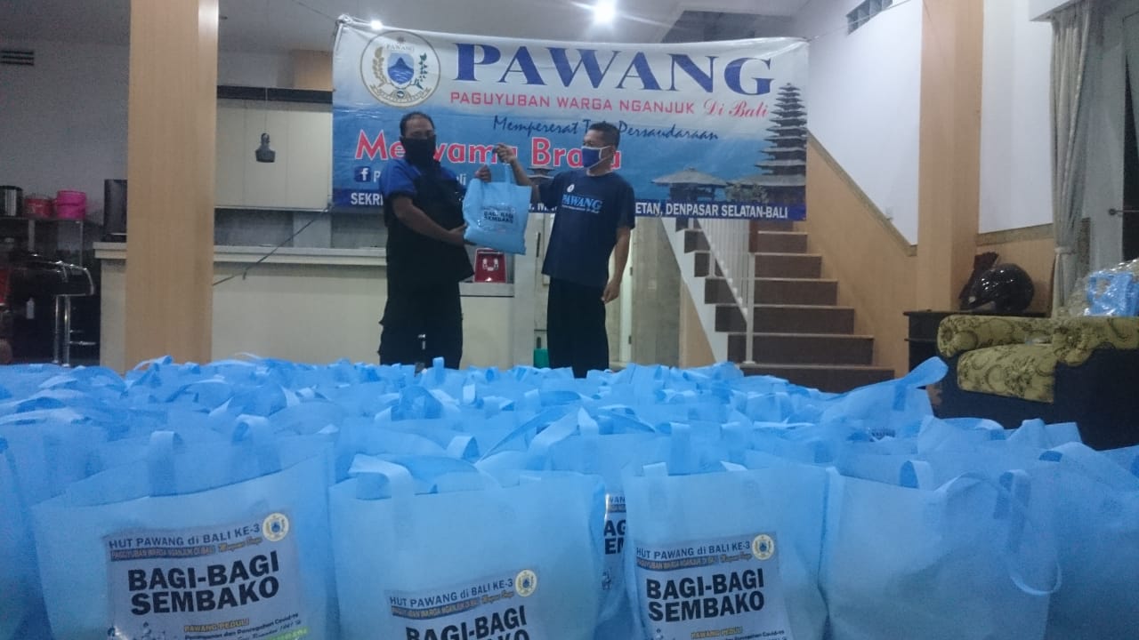 Wabah pandemi virus Corona atau Covid-19 berdampak terhadap ekonomi masyarakat Bali. Dalam rangka meringankan beban warga yang terhadap Covid-19, Paguyuban Warga Nganjuk (Pawang) di Bali membagikan paket sembako.
