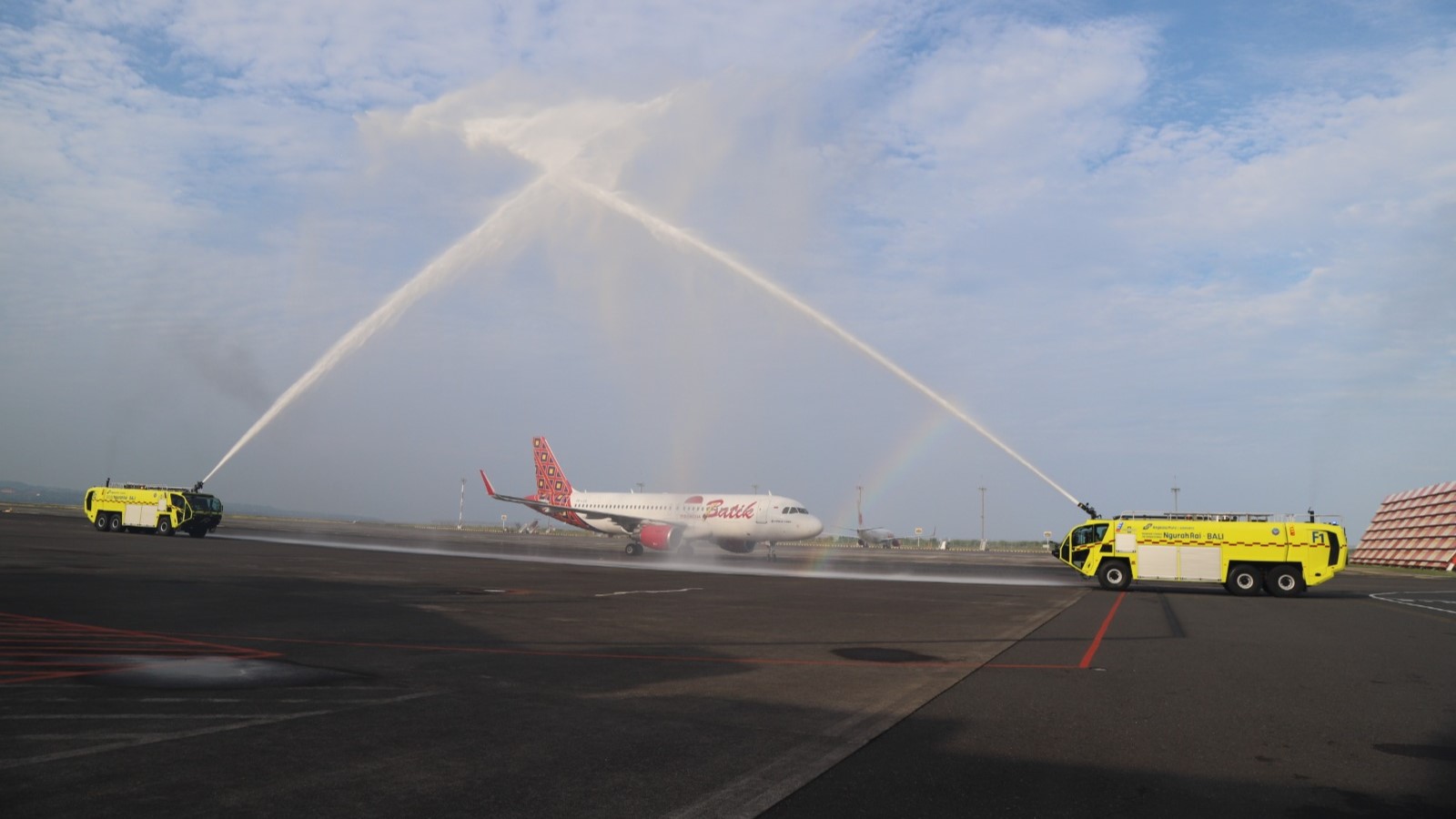 Penerbangan perdana maskapai Batik Air dengan rute Balikpapan – Denpasar menggunakan pesawat tipe Airbus A320 dengan nomor penerbangan ID 6765 mendarat dengan disambut water salute di Bandara Internasional I Gusti Ngurah Rai pada pukul 08.00 WITA.