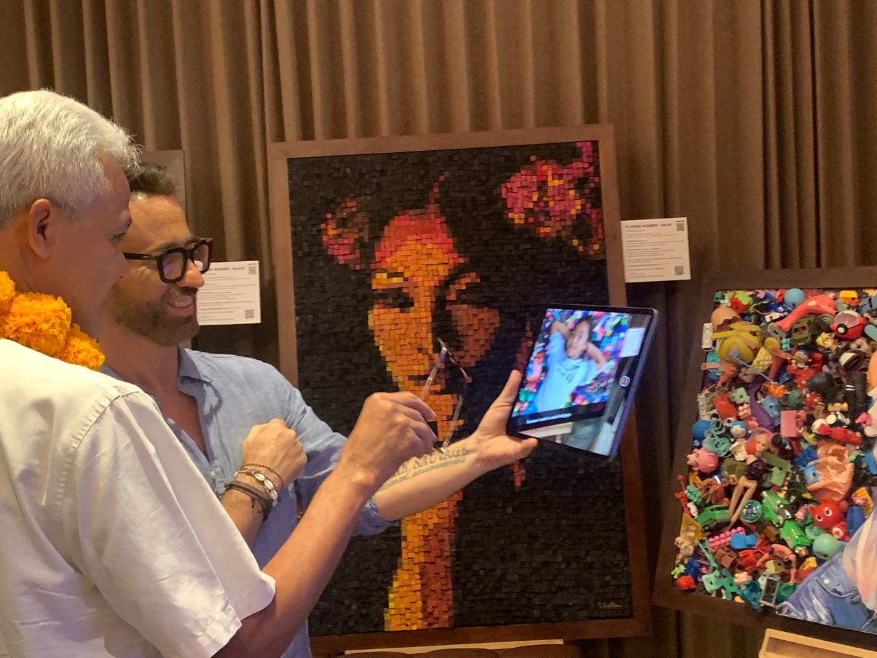 Sementara Mickael menampilkan karya-karya dari potongan sandal bekas yang dikumpulkannya di sepanjang pantai di Bali, Setelah dipotong dan ditata dalam kanvas kemudian dilakukan pewarnaan sehingga muncul-mnuncul figur yang unik dan menarik.