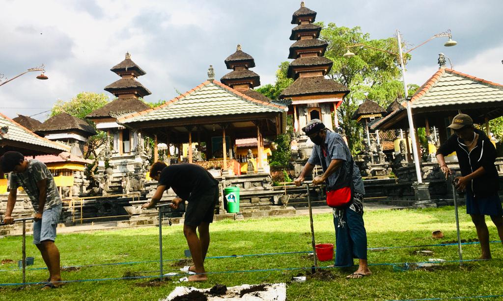Sekelompok anak muda tampak sibuk di dalam Pura Desa Adat Buleleng. Menggunakan sebuah alat sederhana, beberapa lubang dibuat di antara rerumputan hijau lalu ditutup kembali dengan sebuah lempengan beton dengan 4 mata lubang.