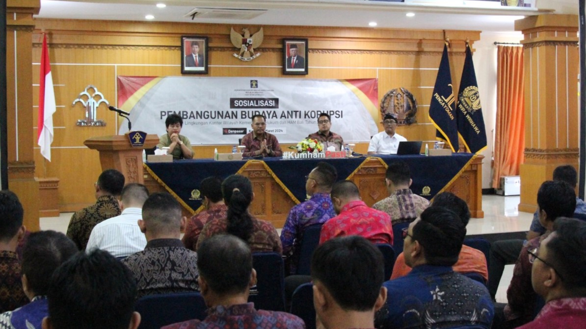 DENPASAR, kanalbali.id –  Dalam upaya meningkatkan pemahaman seluruh jajaran guna terwujudnya tata kelola pemerintahan yang bersih, transparan, dan berbudaya Anti Korupsi, Kanwil Kemenkumham Bali Menyelenggarakan Sosialisasi Pembangunan Budaya Anti Korupsi Tahun 2024, bertempat di Aula Kantor Imigrasi Kelas I TPI Denpsar pada Kamis, (28/03).