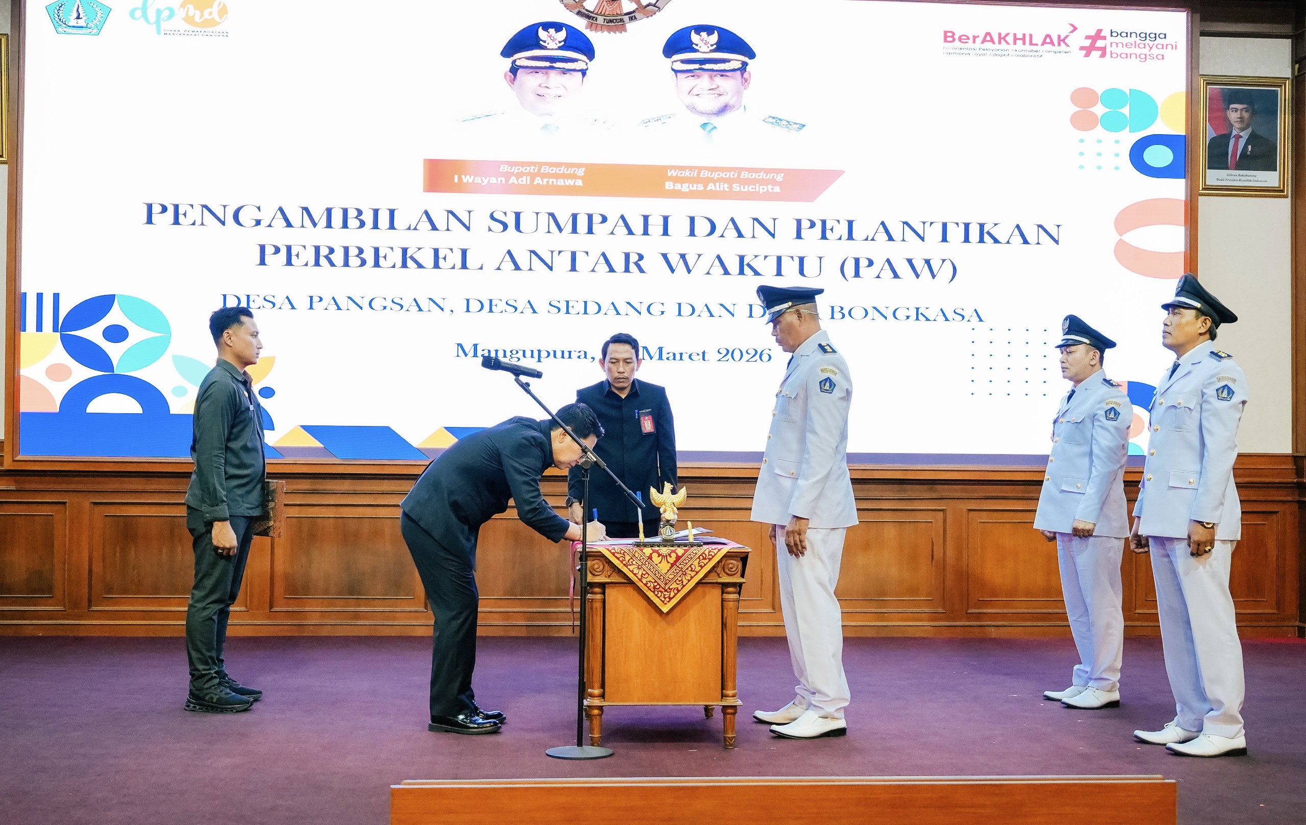 Yakni, I Gusti Ngurah Muliharta sebagai Perbekel Pangsan Kecamatan Petang periode Tahun 2026 – 2029, atas nama I Gusti Ngurah Suwindra sebagai Perbekel Sedang Kecamatan Abiansemal periode Tahun 2026 – 2029 dan atas nama I Gusti Agung Sumajaya sebagai Perbekel Bongkasa Kecamatan Abiansemal periode 2026 – 2030.