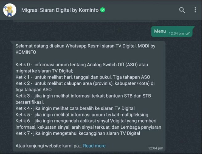 “Bagi masyarakat yang ingin mengakses chatbot Whatsapp Migrasi Siaran Digital bisa melalui nomor whatsapp 08118202208,” katanya dalam siaran pers, Sabtu, (18/6/2022).
