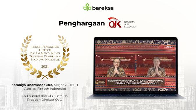 JAKARTA- Otoritas Jasa Keuangan (OJK) memberikan penghargaan kepada Presiden Direktur OVO dan Co-founder/CEO Bareksa, Karaniya Dharmasaputra sebagai Tokoh Penggerak Fintech dalam mendukung program pemulihan ekonomi nasional.