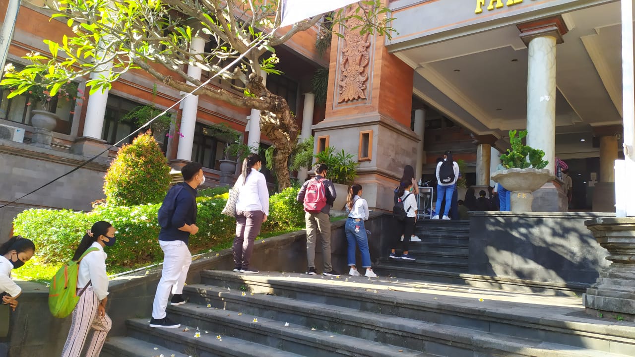 PELATARAN Fakultas Kedokteran Universitas Udayana (UNUD) di Jalan PB Sudirman, Denpasar, dihiasi tanda penyekat yang masing-masing berjarak satu meter. Disitu berdiri sejumlah calon mahasiswa yang akan menjalani Ujian Tulis Berbasis Komputer (UTBK) SBMPTN 2020.
