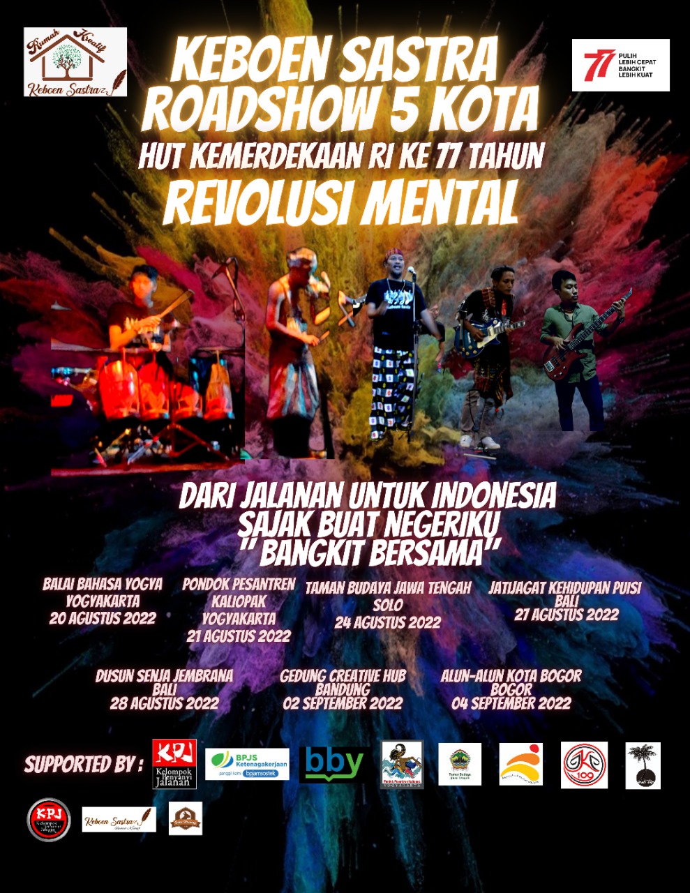 Road show anak-anak jalanan Kota Bogor ini dihelat untuk memeriahkan Hari Ulang Tahun (HUT) RI ke 77. “Tema yang kami usung Revolusi Mental, Dari Jalanan Untuk Indonesia, Sajak Buat Negeriku, Bangkit Bersama,”.