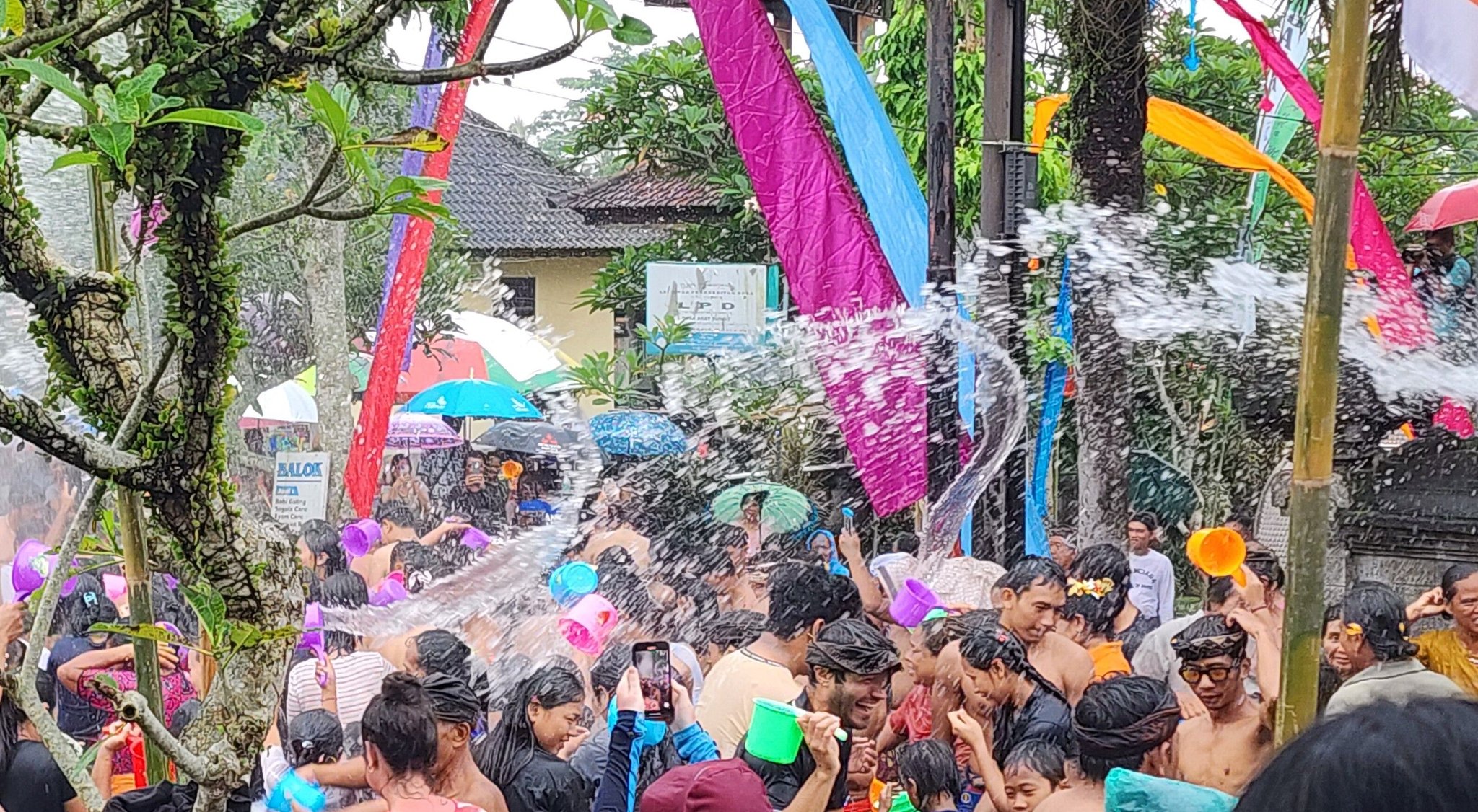 Perang air di desa Suwat, Gianyarsebagai wujud syukur warga atas limpahan air yang memberikan kesejahteraan untuk warga.