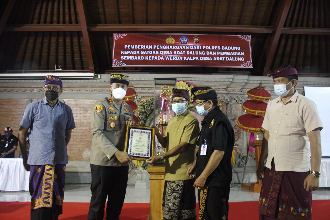 BADUNG – Kapolres Badung AKBP Leo Dedy Defretes memberikan penghargaan Kepada Satgas Desa Adat Dalung, Kecamatan Kuta Utara, karena dinilai sukses menangani COVID-19.