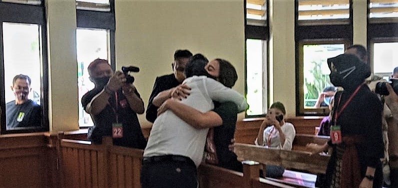 Jerinx memeluk Nora usai persidangan - WIB