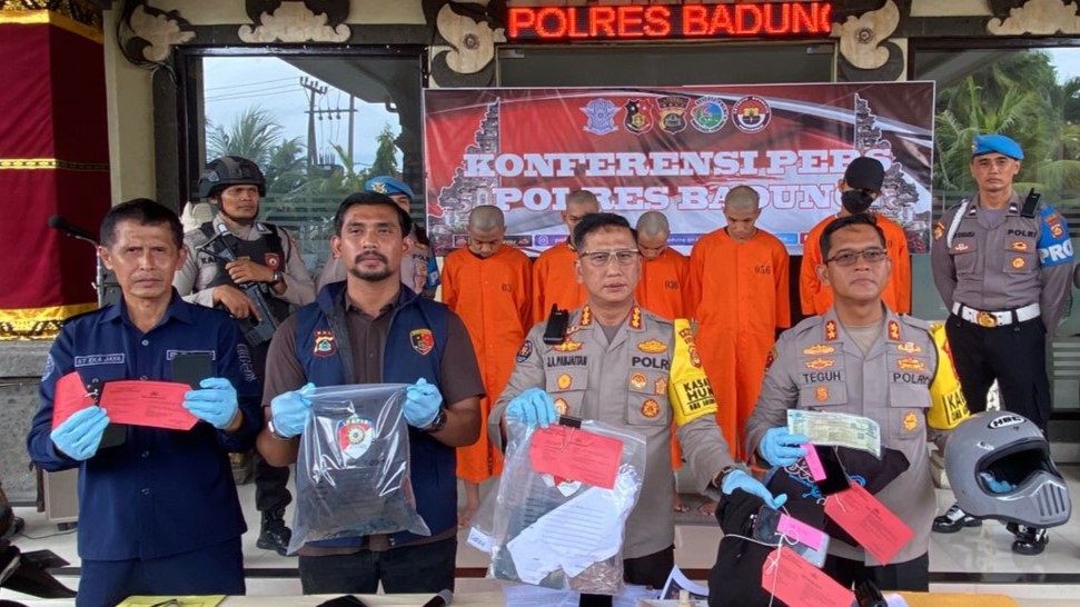 “Total lima orang yang berhasil diamankan.Adapun proses penangkapan terhadap para tersangka dilakukan bersama-sama oleh Satreskrim Polres Badung dengan tim dari Ditreskrimum Polda Bali dan berkoordinasi dengan Polres jajaran di Polda Jawa Timur,” kata Kabid Humas Kombes Pol Jansen Avitus Panjaitan, di Mapolres Badung, Selasa (23/1).