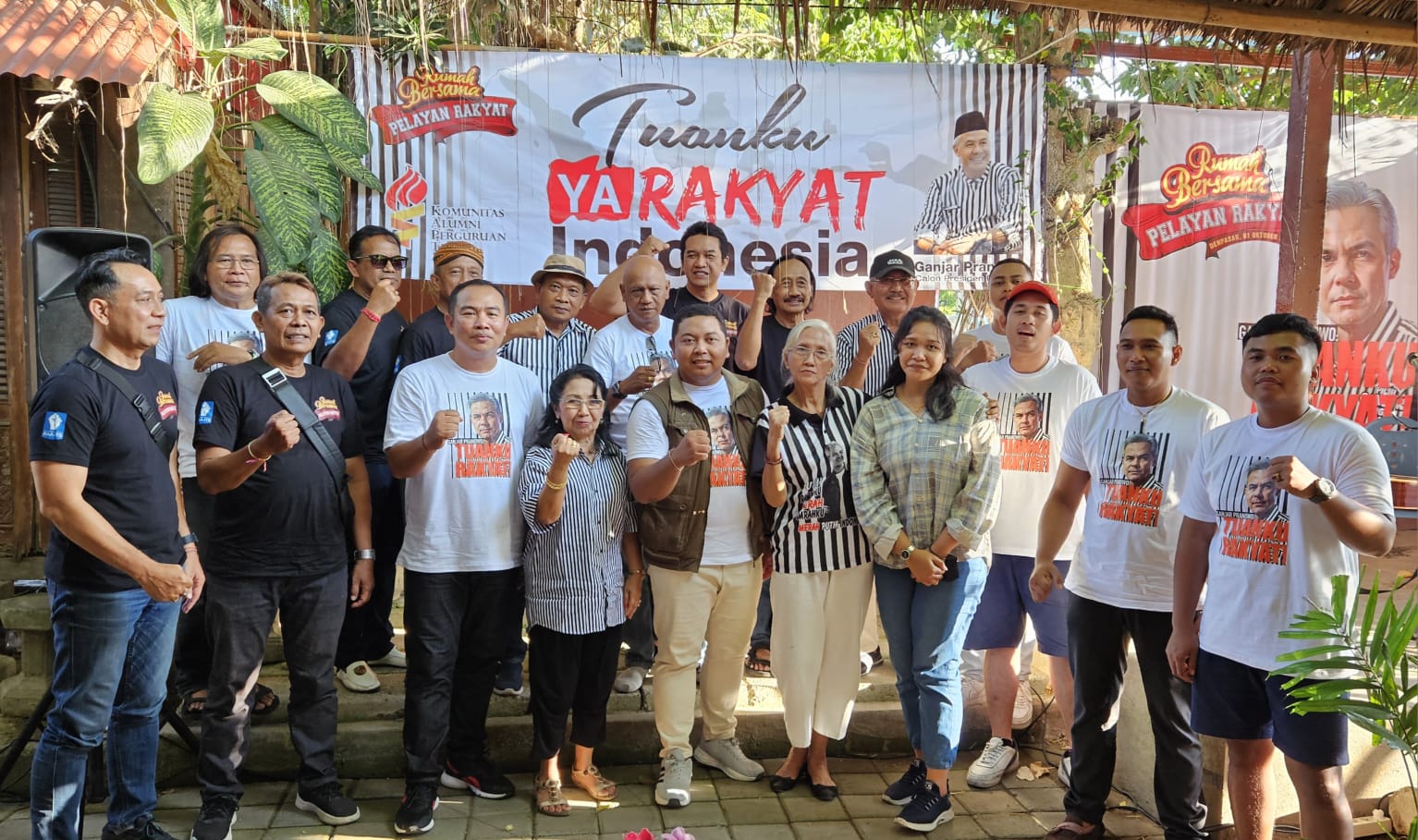 Puluhan alumni yang hadir kompak mengenakan kaos bertuliskan ‘Ganjar Pranowo: Tuanku Ya Rakyat’. Mereka datang dari berbagai angkatan, ada yang baru wisuda, ada pula yang angkatan kuliahnya tahun 1982.