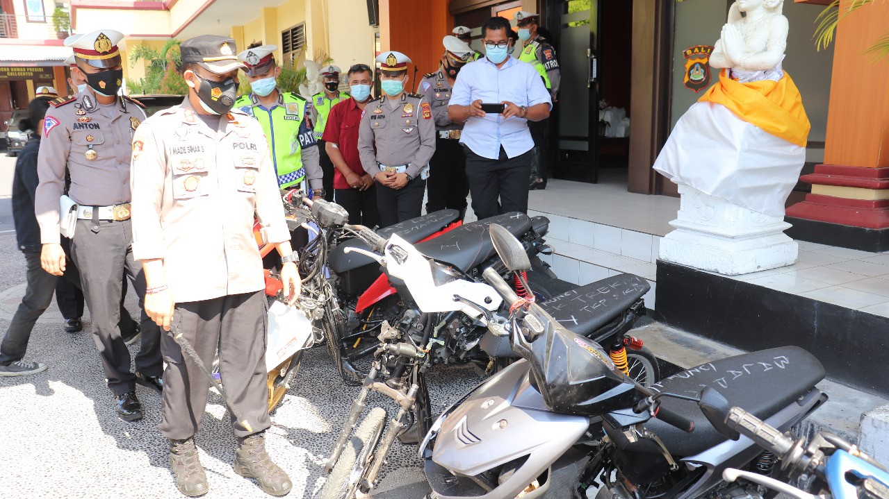 BULELENG- Kepolisian Polres Buleleng, Bali, mengamankan puluhan sepeda motor yang terlibat balapan liar di dua lokasi di Kabupaten Buleleng, Bali. “Dari, hasil penindakan yang dilakukan Polres Buleleng telah berhasil mengamankan balapan liar yang terjadi di dua tempat kejadian,” kata Kasubag Humas Polres Buleleng, Bali, Iptu Gede Sumarjaya, Rabu (2/6).