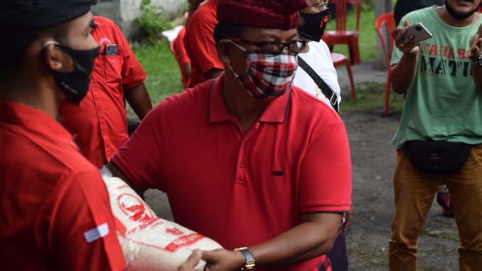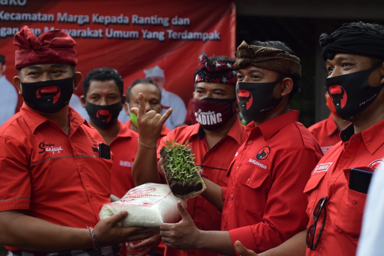 TABANAN – Memperingati hari lahir Pancasila, 1 Juni dan bulan Bung Karno PAC PDI Perjuangan Marga bergotong-royong dalam membantu masyarakat terdampak Covid-19. Bantuan tersebut terdiri dari 3 ton beras, 1.600 bibit cabai dan cairan desinfektan. Kegiatan tersebut dilakukan secada simbolis di sekretariat bersama Ranting PDI Perjuangan se-Kecamatan Marga, Senin 1 Juni 2020.