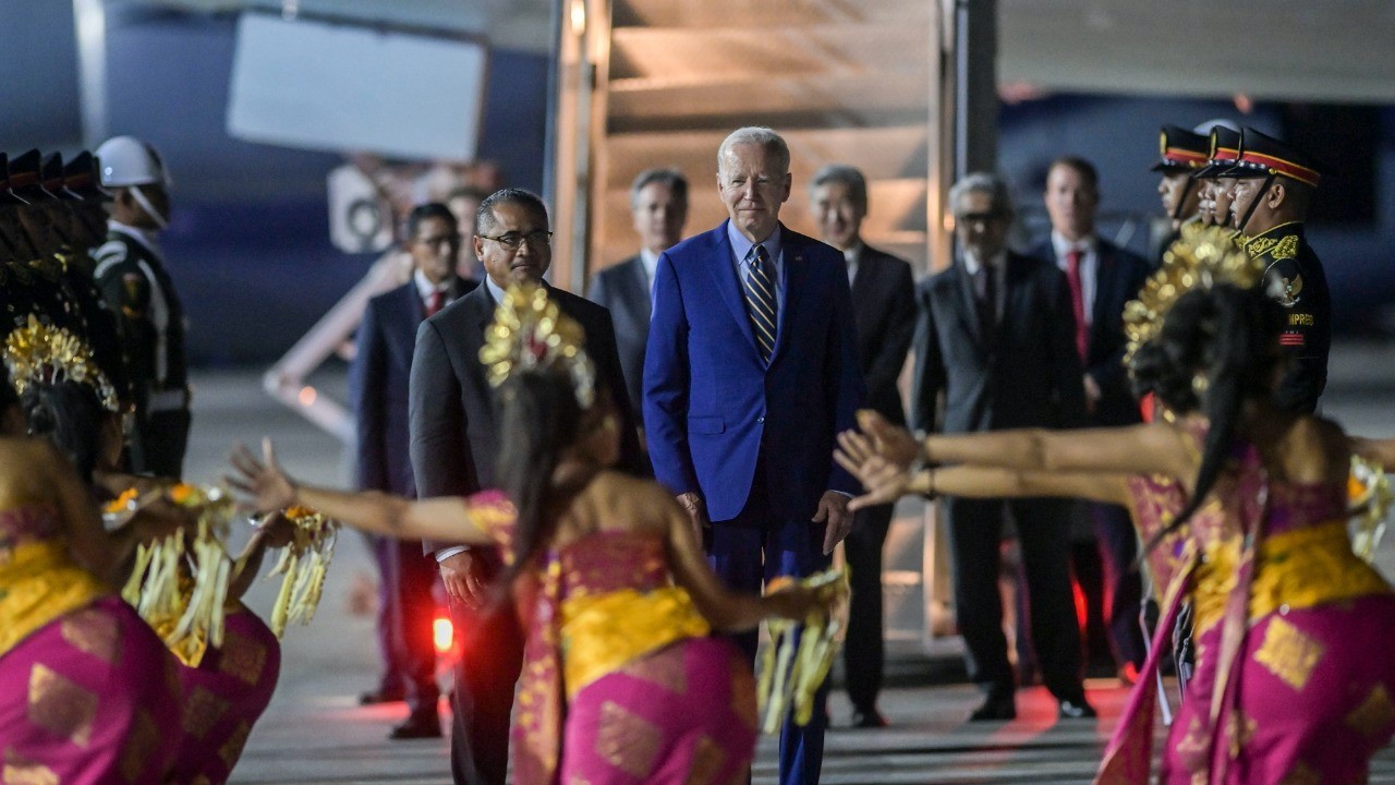 As walking down the stairs of Air Force One, Biden who wore navy blue suit was welcomed by the Indonesian Minister of Tourism and Creative Economy Sandiaga Uno.