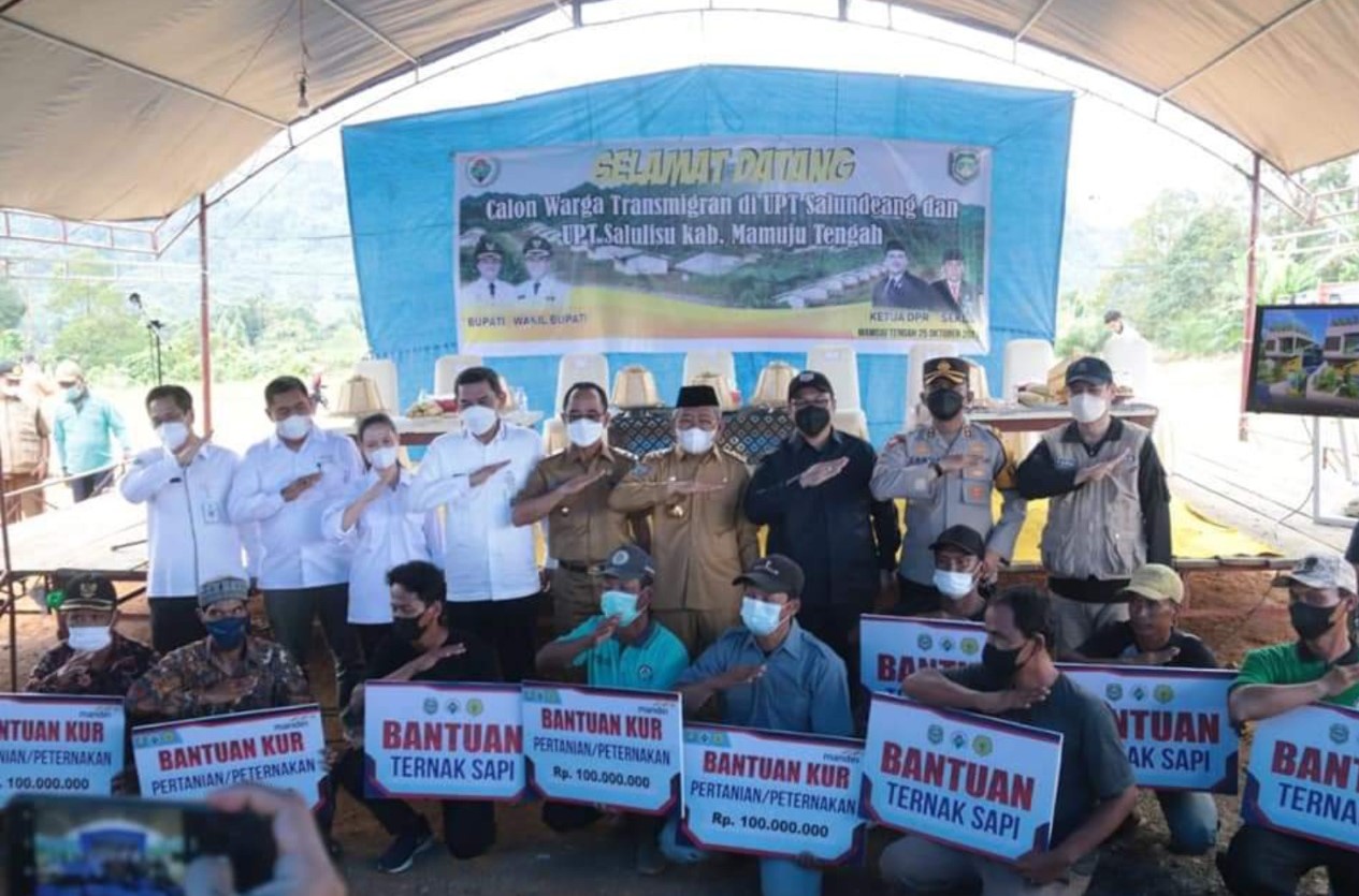 MAMUJU – Gubernur Sulawesi Barat, H. Andi Ali Baal Masdar, dan Wakil Bupati Mamuju Tengah, Drs H Muh Amin Jasa MM, didampingi Staf Ahli Menteri Bidang Hukum dan Reformasi Birokrasi Kementerian Desa, PDT, dan Transmigrasi, Raden Hari Pramudiono beserta jajaran Ditjen PPKTrans, Kepala OPD Lingkup Pemprov Sulbar dan Pemkab Mamuju Tengah, serta warga sekitar menyambut hangat kedatangan 11 KK/39 Jiwa Transmigran Asal Provinsi Jawa Timur (Jatim) dan 10 KK/33 Jiwa Asal DIY di Lapangan Depan Kantor UPTD Saluandeang, Kabupaten Mamuju Tengah, Provinsi Sulawesi Barat, Selasa (26/10/2021).
