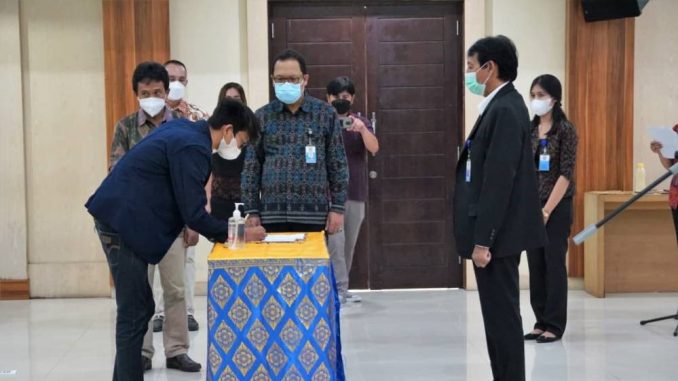 Selanjutnya dilakukan penandatanganan berita acara Penyumpahan dan Pelantikan yang dilakukan secara simbolis oleh Ketua dan Wakil Ketua BEM dengan Rektor Universitas Udayana.