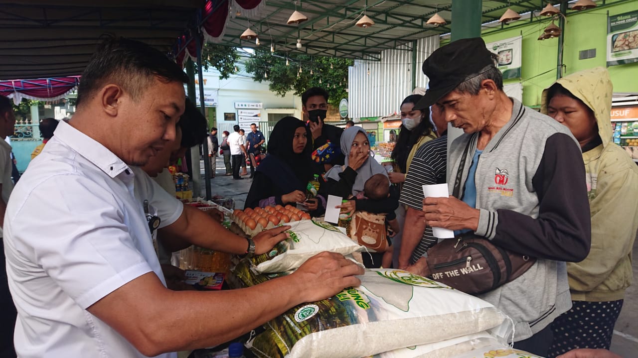 Ratusan masyarakat di Kelurahan Panjer Denpasar Selatan, tumpah ruwah berbelanja di pasar murah yang digelar di areal musala Baitul Mukminin BKDI Bali, di Jalan Tukad Batu Agung Denpasar.