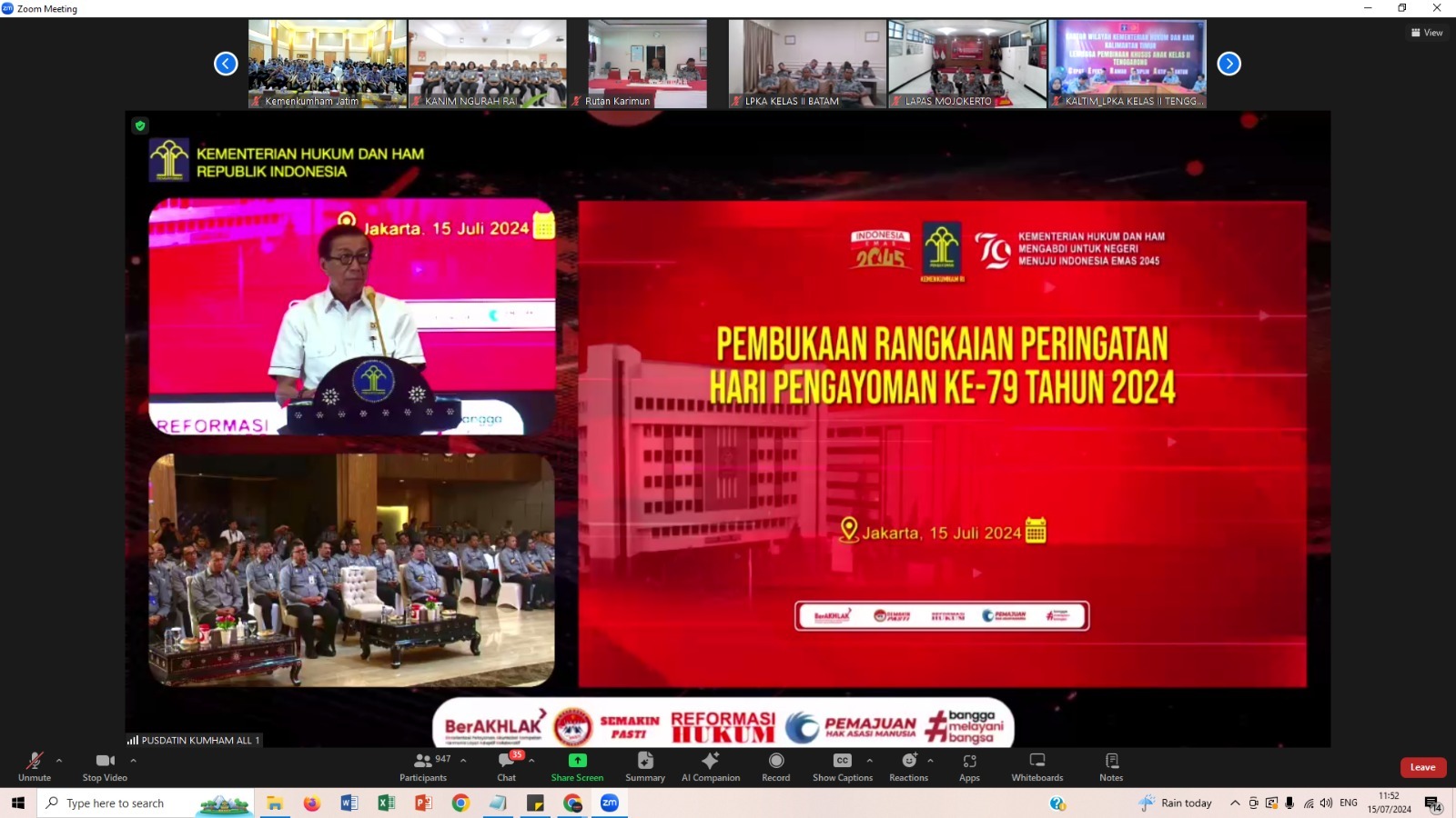 Kegiatan ini merupakan persiapan awal memperingati Hari Ulang Tahun (HUT) Kemerdekaan Republik Indonesia dan Hari Pengayoman ke-79 tahun, diadakan acara pembukaan rangkaian peringatan hari Pengayoman ke-79 tahun 2024 sekaligus doa bersama Kemenkumham untuk negeri. Acara ini secara terpusat dilaksanakan di Graha Pengayoman, Jakarta (15/07/24).