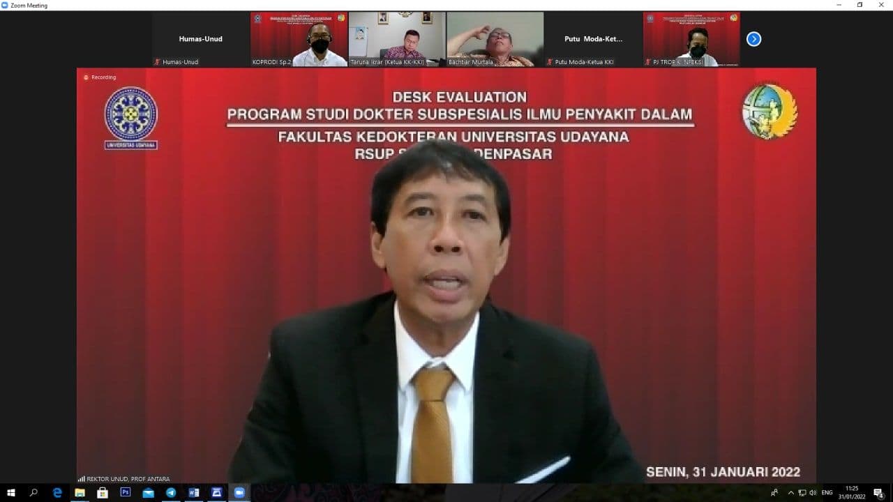 DENPASAR, kanalbali.id – Program Studi Dokter Subspesialis Ilmu Penyakit Dalam FK Unud/RSUP Sanglah melakukan “Desk Evaluation” yang berlangsung secara daring melalui Zoom Meeting, Senin (31/1/2022). Kegiatan ini dihadiri Rektor Unud, Dekan dan Wakil Dekan FK, Para Kooprodi, LP3M, Ka UPT Perpustakaan, Dirut RSUP Sanglah, Ketua KKI dan Jajaran serta Undangan lainnya.