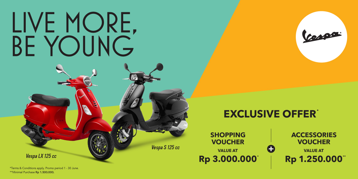 “Penawaran istimewa ini kami hadirkan bagi pencinta lifestyle yang beraspirasi untuk menuangkan gaya unik dan karakter mereka melalui desain otentik khas Vespa sekaligus menunjukkan semangat jiwa muda mereka melalui kesenangan berkendara dengan penuh gaya. Vespa LX dan Vespa S dapat menjadi opsi terbaik bagi mereka yang ingin merasakan semangat berkendara yang istimewa bersama orang-orang terdekat dengan desain Vespa klasik maupun sporty, namun tetap memiliki sentuhan kekinian, fungsionalitas modern dan kenyamanan berkendara. Karena itulah, program ‘Live More, Be Young’ ini kami hadirkan sebagai program special di bulan Juni ini,” ungkap Ayu Hapsari, PR and Communications Manager PT Piaggio Indonesia.