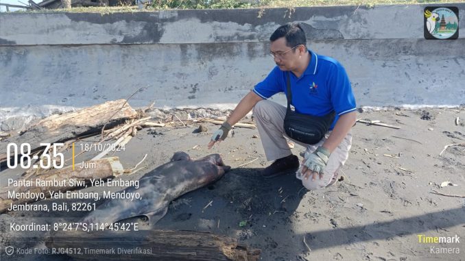 JEMBRANA, kanalbali.id – Seekor lumba-lumba jenis hidung botol ditemukan terdampar mati di pesisir Pantai Pelataran, di Desa Yehembang, Kecamatan Mendoyo, Kabupaten Jembrana, Bali.