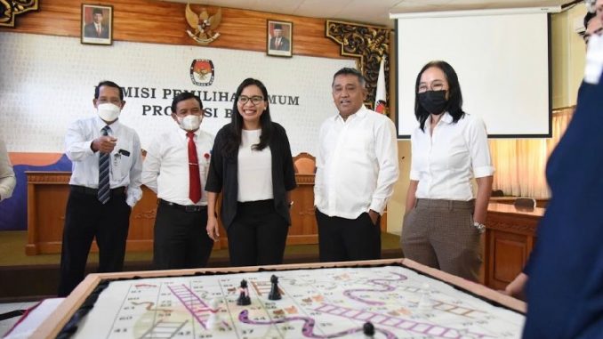 DENPASAR, kanalbali.id – Dalam rangka pelepasan magang, mahasiswa magang MBKM Ilmu Politik Universitas Udayana dibawah bimbingan Dr. Kadek Dwita Apriyani, S.Sos.,M.IP., wujudkan prototype permainan kepemiluan ular tangga sebagai bentuk output dalam kegiatan magang di Komisi Pemilihan Umum Provinsi Bali. Prototype permainan kepemiluan tersebut disimulasikan oleh mahasiswa magang di Ruang Rapat KPU Provinsi Bali. (06/06/2022)