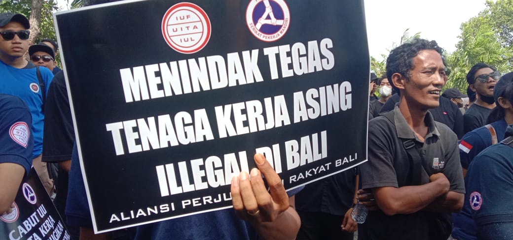Selain itu, ada juga poster bertuliskan,”Katanya gaji 10 juta tapi pulang membawa hutang,” dan juga,”Menindak tegas tenaga kerja asing ilegal di Bali,” serta tulisan,”Naikkan upah buruh,”.