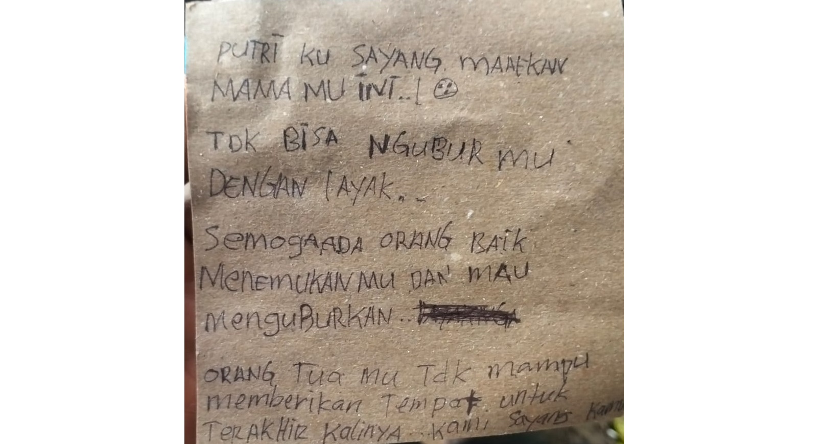 “Putriku sayang maafkan mamamu ini, tidak bisa ngburmu dengan layak. Semoga ada orang baik menemukanmu dan mau menguburkan. Orang tuamu tidak mampu memberikan tempat untuk terakhir kalinya. Kami sayang kamu,” tulis mamanya.