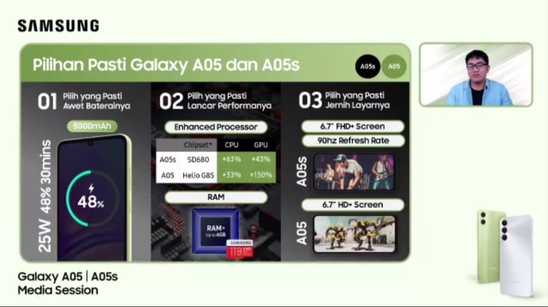 “Galaxy A05 series menghadirkan layar smooth dengan refresh rate hingga 90Hz, kamera utama 50MP yang jernih, dan baterai 5000mAh yang awet seharian, kombinasi fitur-fitur yang pasti cocok untuk mendukung berbagai aktivitas. Ditambah dengan harga terjangkau, tidak perlu ragu lagi untuk move on ke yang pasti-pasti, Galaxy A05 dan A05s, dan maksimalkan hari-harimu,” jelas Ricky Bunardi, MX Product Marketing Senior Manager, Samsung Electronics Indonesia.