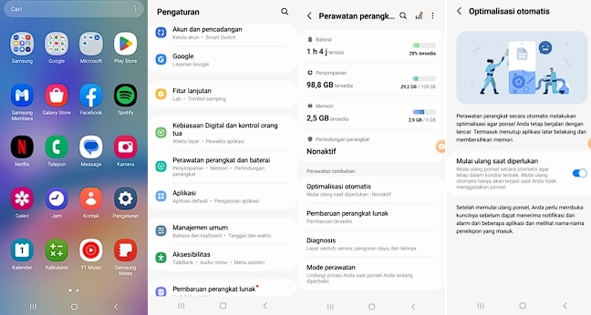 Selain itu, kamu juga bisa memaksimalkan fitur “Optimalisasi Otomatis” dimana Galaxy A05 series kamu akan secara otomatis restart ketika perangkat sedang tidak digunakan (layar mati, tidak sedang dalam panggilan telepon atau memainkan musik), untuk memastikan perangkat terus berjalan secara optimal. Mengaktifkan fitur ini sangat mudah: