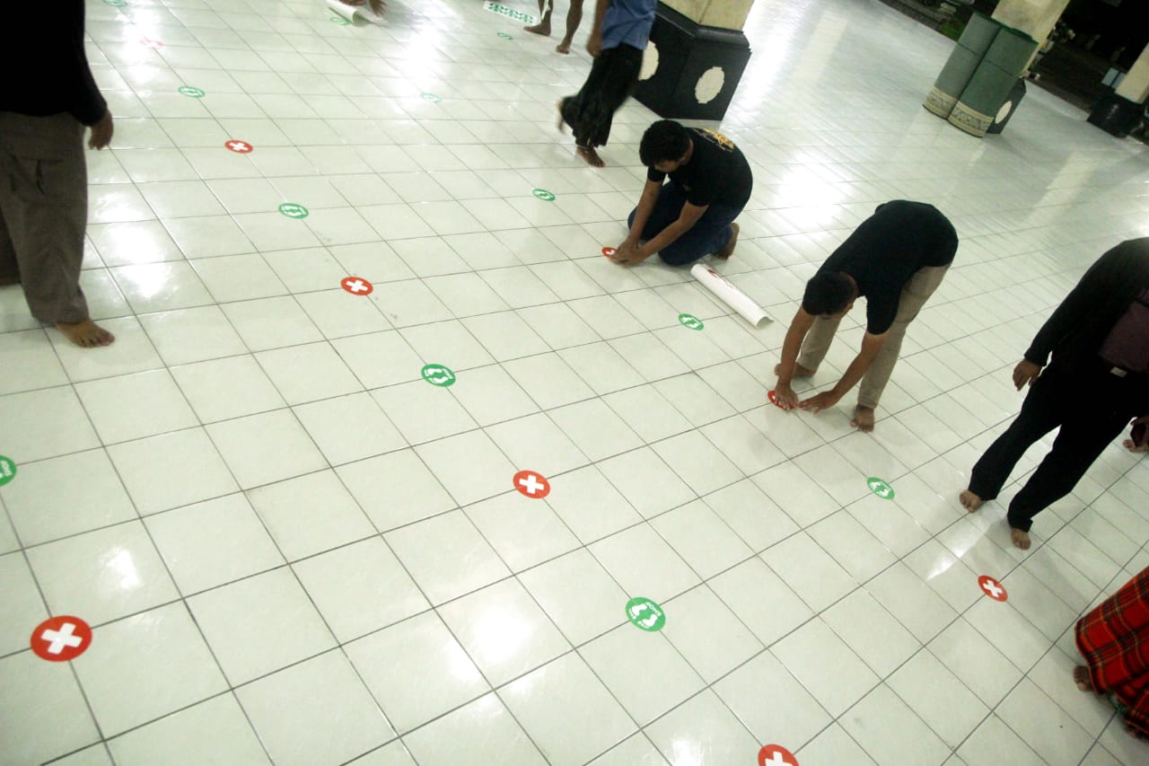 Some mosques in Denpasar began to prepare the arrangement of prayer in congregation. As done in the Sudirman Mosque, Denpasar where the mosque installation of signs of the distance setting.
