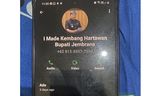 JEMBRANA, kanalbali.id – Beredar sebuah akun nomor whatsapp yang melakukan penipuan dengan mengatasnamakan Bupati Jembrana, Bali, I Made Kembang Hartawan.