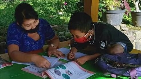 Sementara Astiti juga membuka buku dan mulai memberikan penjelasan. Windu nampak sangat serius menerima pelajaran dari gurunya, sambil sekali-sekali menoleh ke arah neneknya. “Ini kegiatan rutin di masa pandemi. Terutama murid-murid yang kesulitan akses internet dan tidak memiliki HP adroid,” terang Astiti.