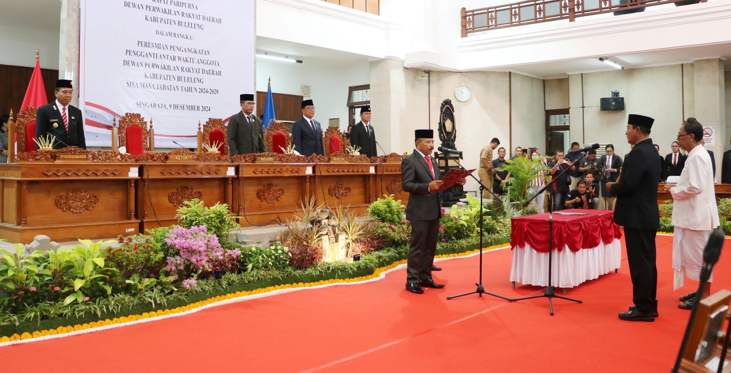 Hal itu diungkapkan Pj Bupati Ketut Lihadnyana saat memberikan sambutan pada acara Peresmian Pengangkatan Pengganti Antar Waktu (PAW) Anggota DPRD Buleleng sisa masa jabatan 2024-2029 di Ruang Sidang Utama Gedung DPRD Buleleng, Senin (9/12). Dalam acara tersebut Ketut Trina Utama diangkat menjadi PAW anggota DPRD menggantikan Gede Supriatna yang mencalonkan diri sebagai wakil bupati Buleleng periode 2025-2030.