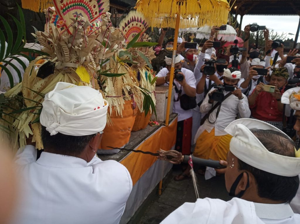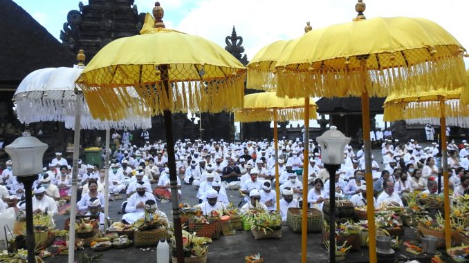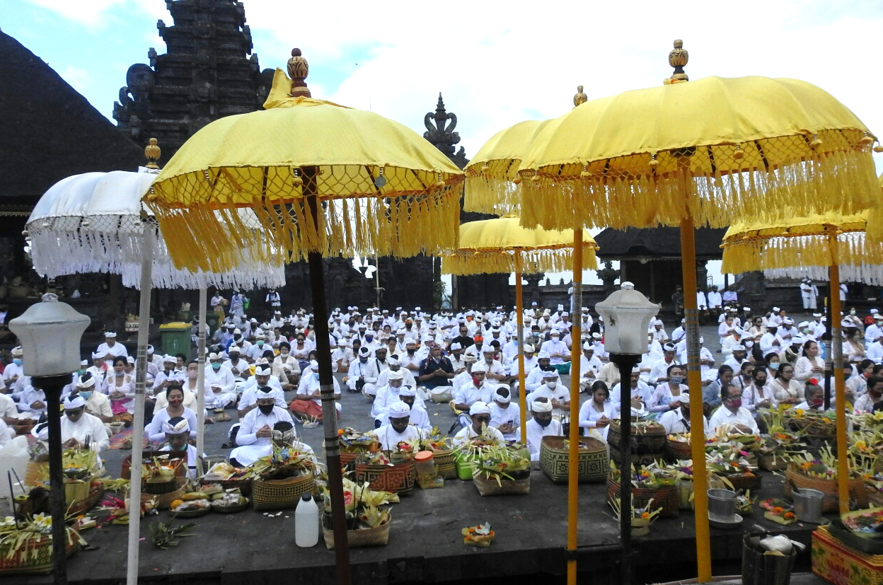 VIBRASI – Upacara berakhir dengan penusukan kendi berisi sesaji. Keagungan Pura Besakih yang berpadu dengan kesungguhan doa umat diharapkan membuat Hyang Widhi Wasa melimpahkan karunianya. Upacara ini meneguhkan cara Bali untuk berdamai dengan alam semesta, skala (fisik) maupun niskala (spiritual) – Zul T Eduardo