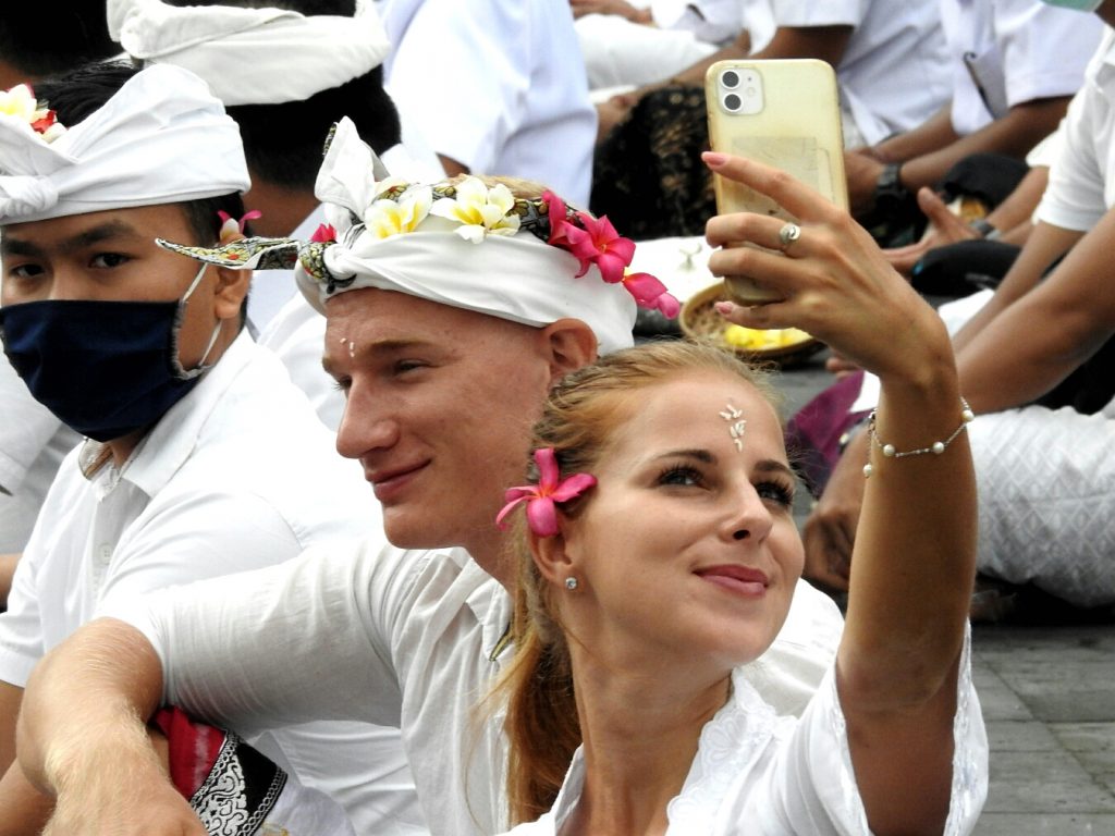 WARGA ASING – Sejumlah warga asing juga turut serta dalam upacara. Upacara ini menjadi kesempatan untuk berswafoto. Di masa new normal kehadiran mereka sebagai wisatawan sangat diharapkan – Zul T Eduardo