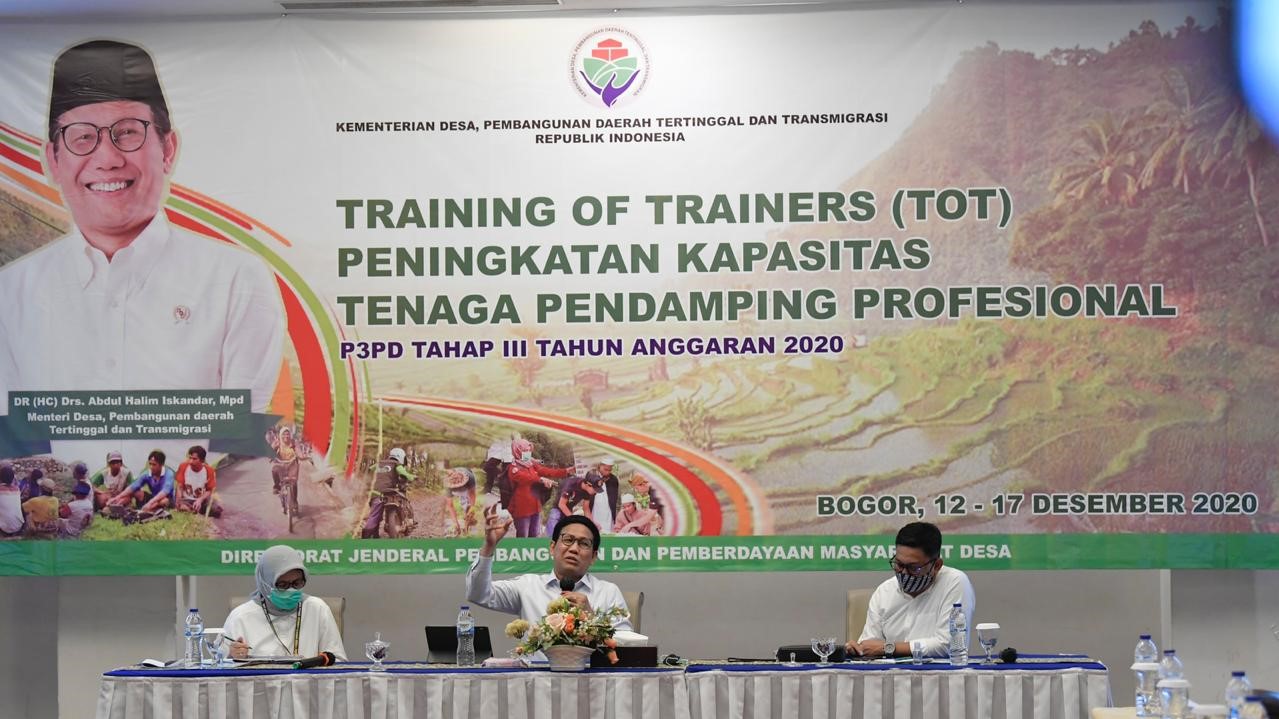BOGOR – Menteri Desa, pembangunan daerah tertinggal dan Transmigrasi (Mendes PDTT), Abdul Halim Iskandar didampingi Plt. Dirjen Pembangunan dan Pemberdayaan Masyarakat Desa, Rosyidah Rachmawaty dan Staf Khusus Menteri, Abdul Malik Haramain beri arahan dalam kegiatan Training of Trainers (TOT) Peningkatan Kapasitas Tenaga Pendamping Profesional P3PD tahap III di Hotel Salak Padjajaran Bogor, Senin (14/12/2020).