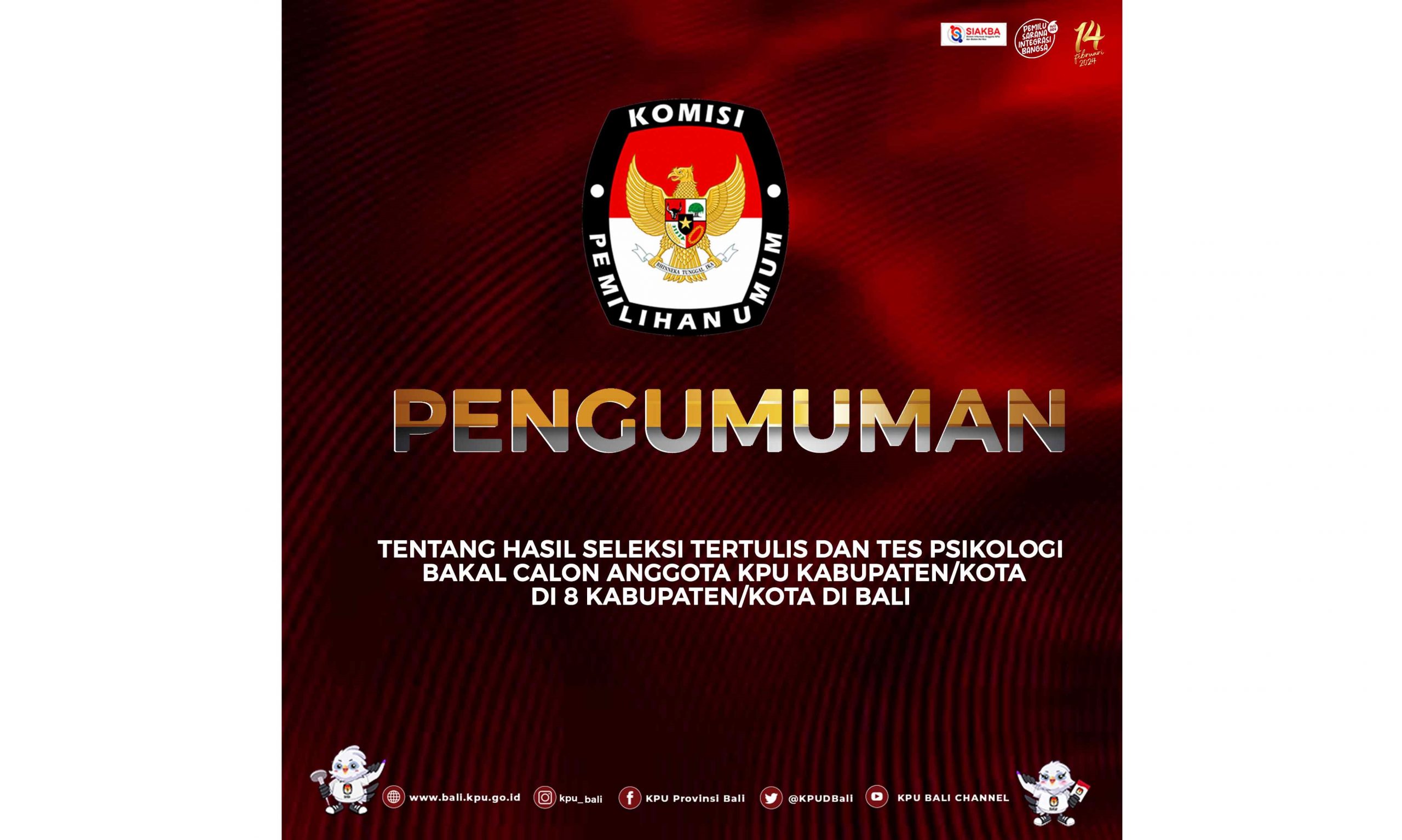DENPASAR – Tim Seleksi Calon Anggota KPU Kabupaten/Kota Bali 1 dan Bali 2 Periode 2023 – 2028 mengumumkan hasil seleksi Bakal Calon yang lulus Seleksi Tertulis dan Tes Psikologi melalui pengumuman : Nomor 044/TIMSELKABKOT-GEL.6-Pu/03/51-01/2023, : TENTANG HASIL SELEKSI TERTULIS DAN TES PSIKOLOGI BAKAL CALON ANGGOTA KPU KABUPATEN BADUNG, BULELENG, JEMBRANA DAN TABANAN PERIODE 2023-2028