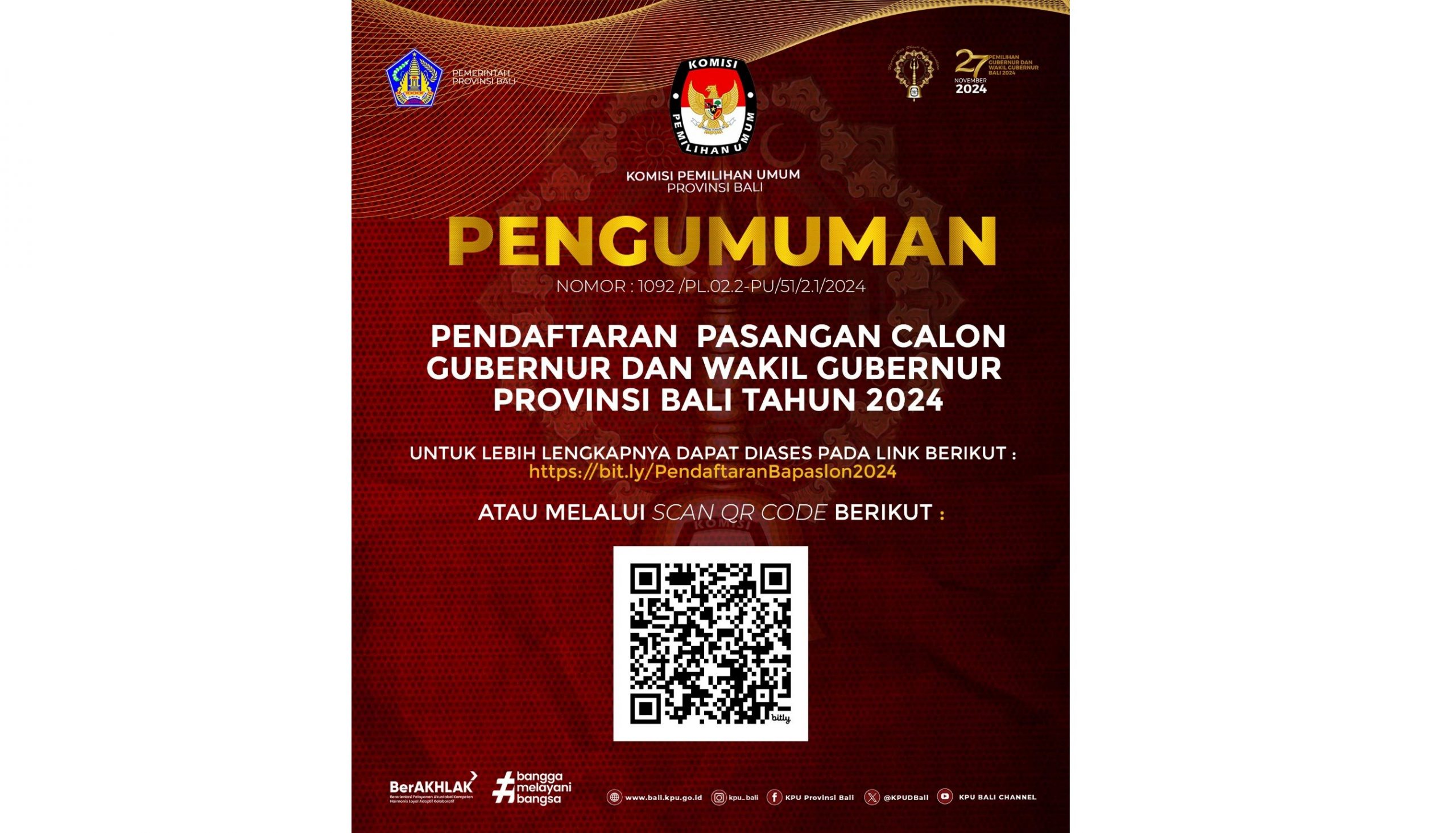 KPU Provinsi Bali telah menerbitkan Pengumuman Nomor: 1092/PL.02.2-PU/51/2024 tentang Pendaftaran Pasangan Calon Gubernur dan Wakil Gubernur Provinsi Bali Tahun 2024 pada tanggal 24 Agustus 2024