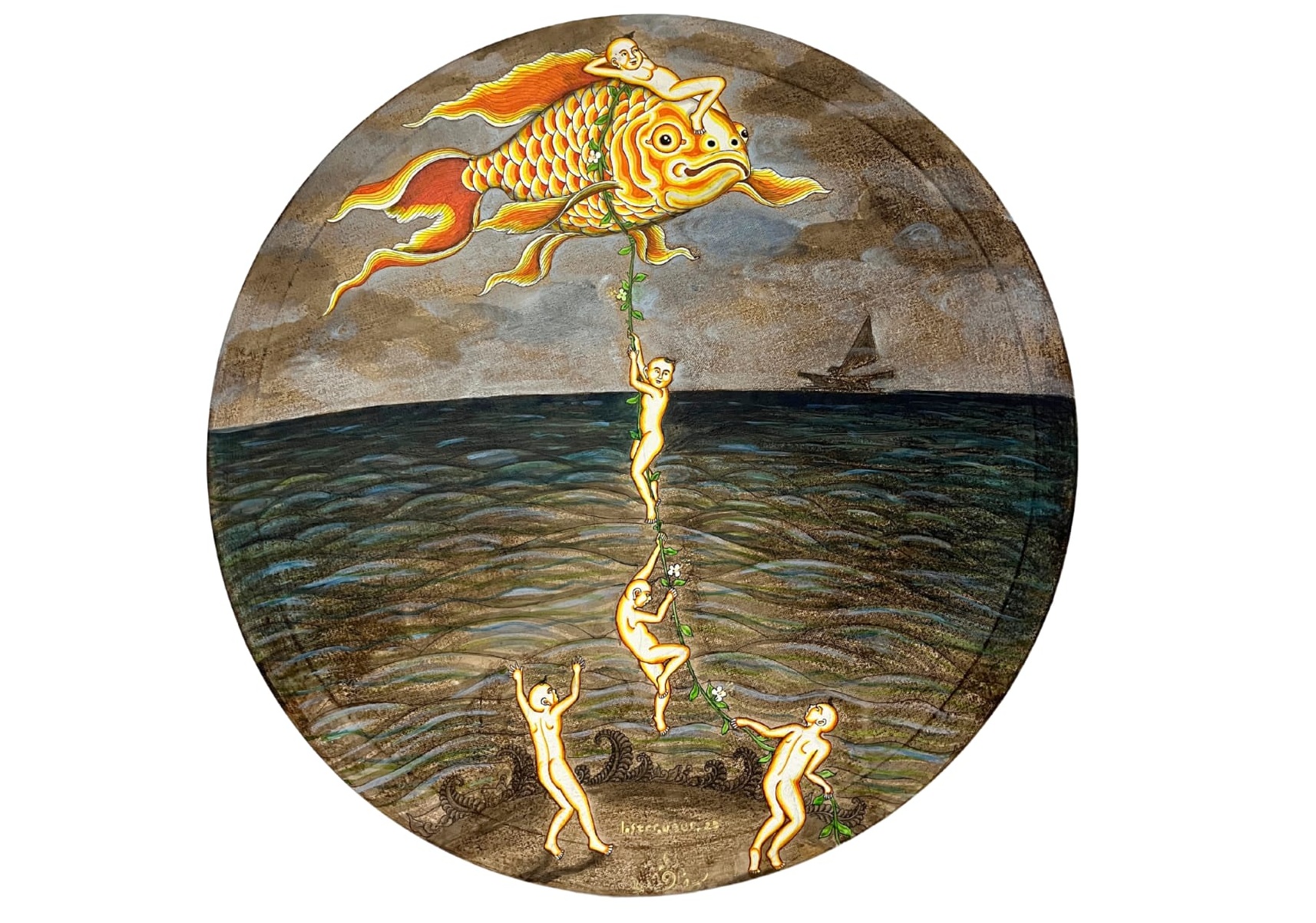 Lukisan berbentuk lingkaran ini, menampilkan seekor ikan mas besar berwarna oranye keemasan yang menonjol sebagai fokus utama. Di atas punggung ikan, duduk santai seorang anak kecil, memberikan kesan keceriaan dan kebebasan.