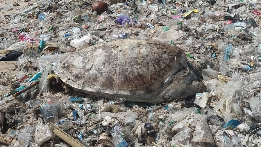 BADUNG, kanalbali.id- Bangkai penyu berukuran besar mati di tumpukan sampah plastik yang berserakan di Pantai Kedonganan, Kecamatan Kuta, Kabupaten Badung, Bali, pada Kamis (12/1).