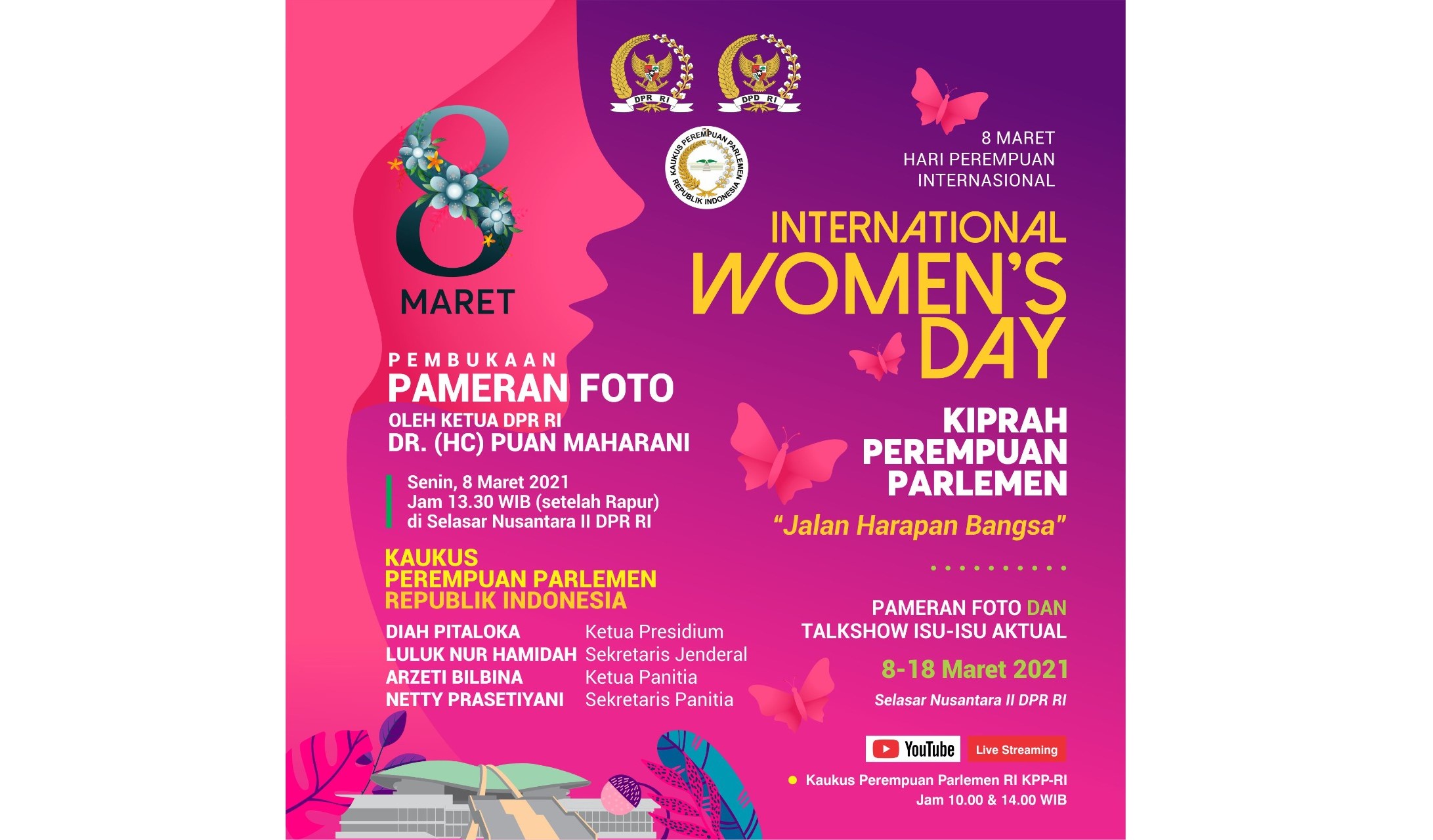 JAKARTA – Dalam rangka merayakan Hari Perempuan Internasional, Kaukus Perempuan Parlemen Republik Indonesia akan mengadakan pameran foto dan rangkaian talkshow bertajuk “Kiprah Perempuan Parlemen: Jalan Harapan Bangsa.” Pameran foto dan rangkaian talkshow dengan beragam topik terkini itu akan digelar 8-18 Maret 2021 di Selasar Gedung Nusantara II, Kompleks Parlemen, Senayan.