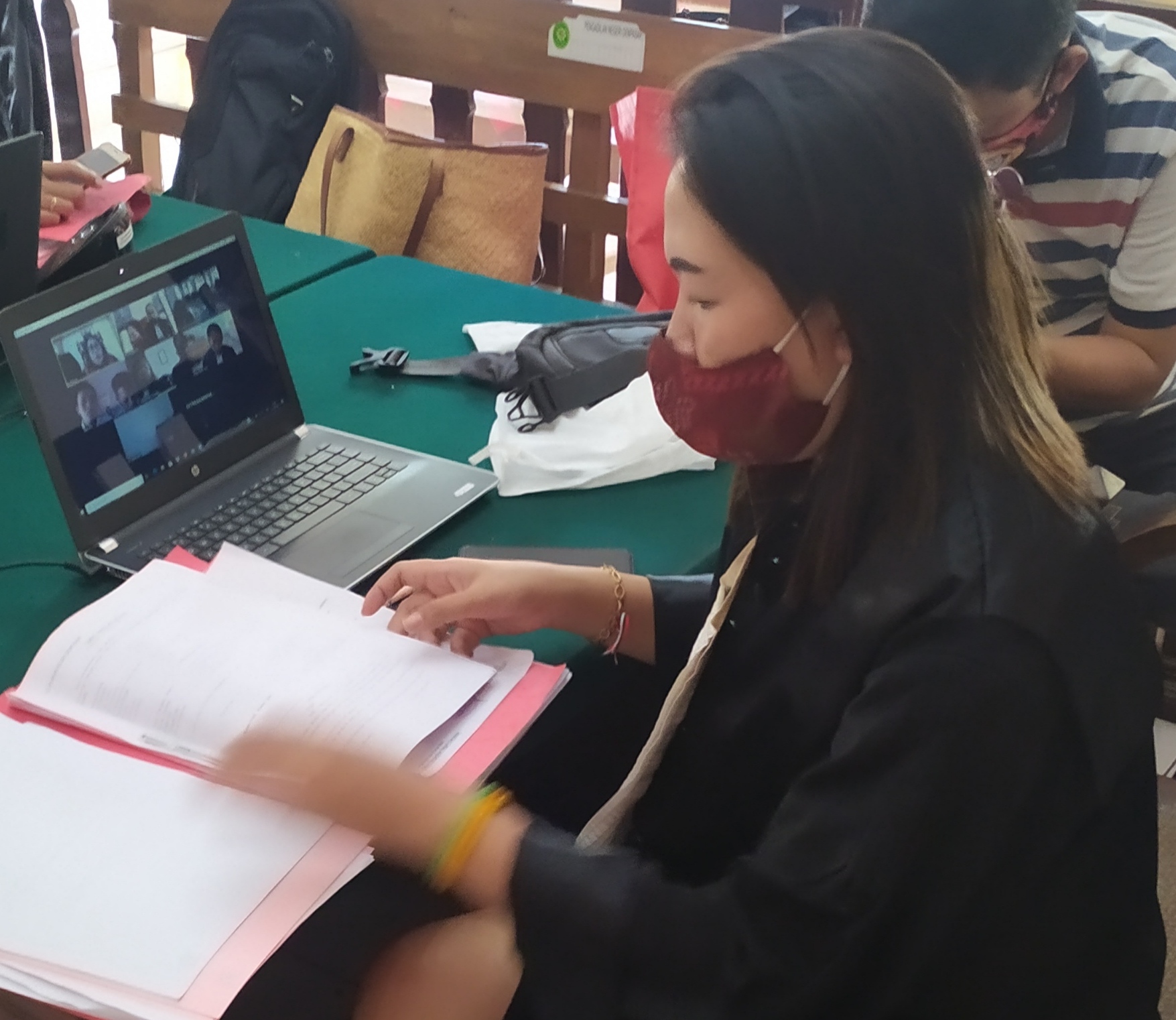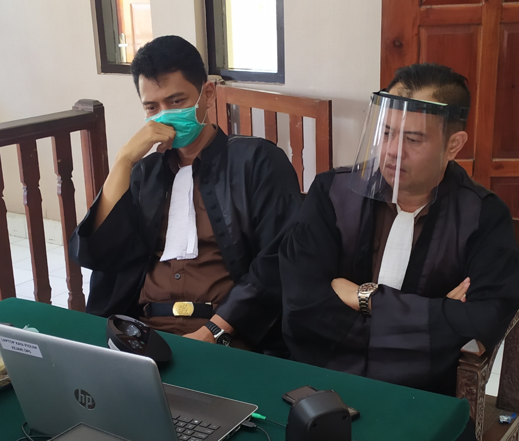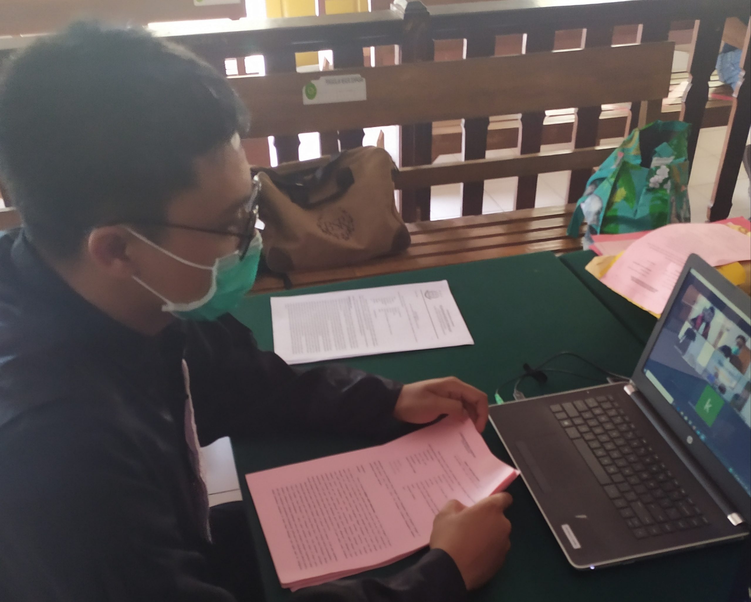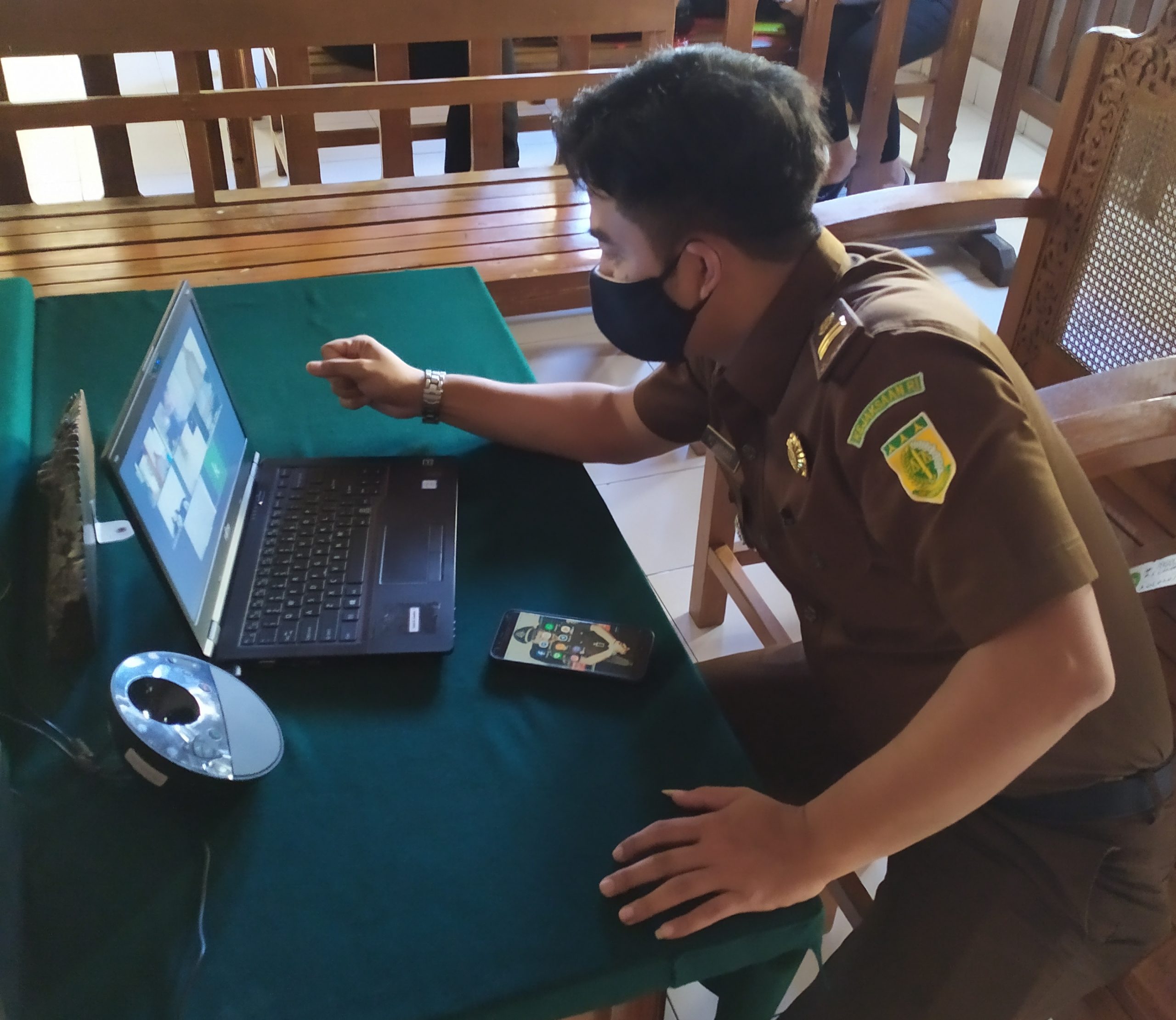 Kendati berhadapan di dunia maya tidak mengurangi tingkat disiplin para Jaksa Penuntut Umum (JPU) dan Hakim melaksanakan persidangan, mereka tetap mengenakan masker saat melaksanakan tugasnya.