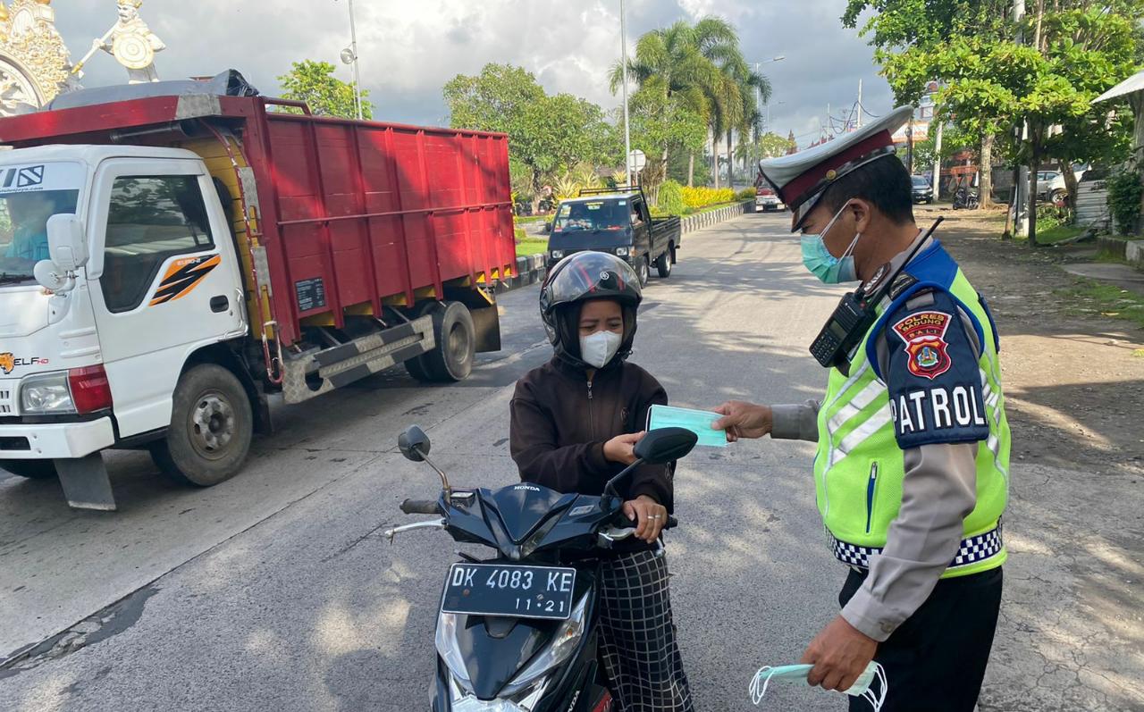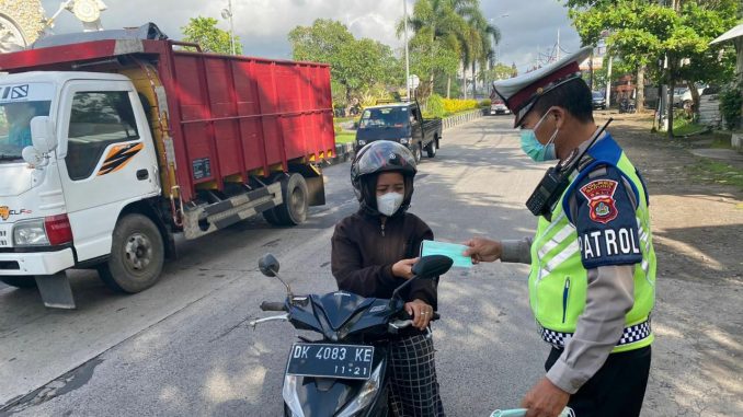 BADUNG – Satlantas Polres Badung membagikan masker ke pengendara, selain itu juga menghimbau tentang protokol kesehatan (Prokes) terhadap masyarakat yang melintas di Simpang Patung Rama Sinta, Minggu (19/9).