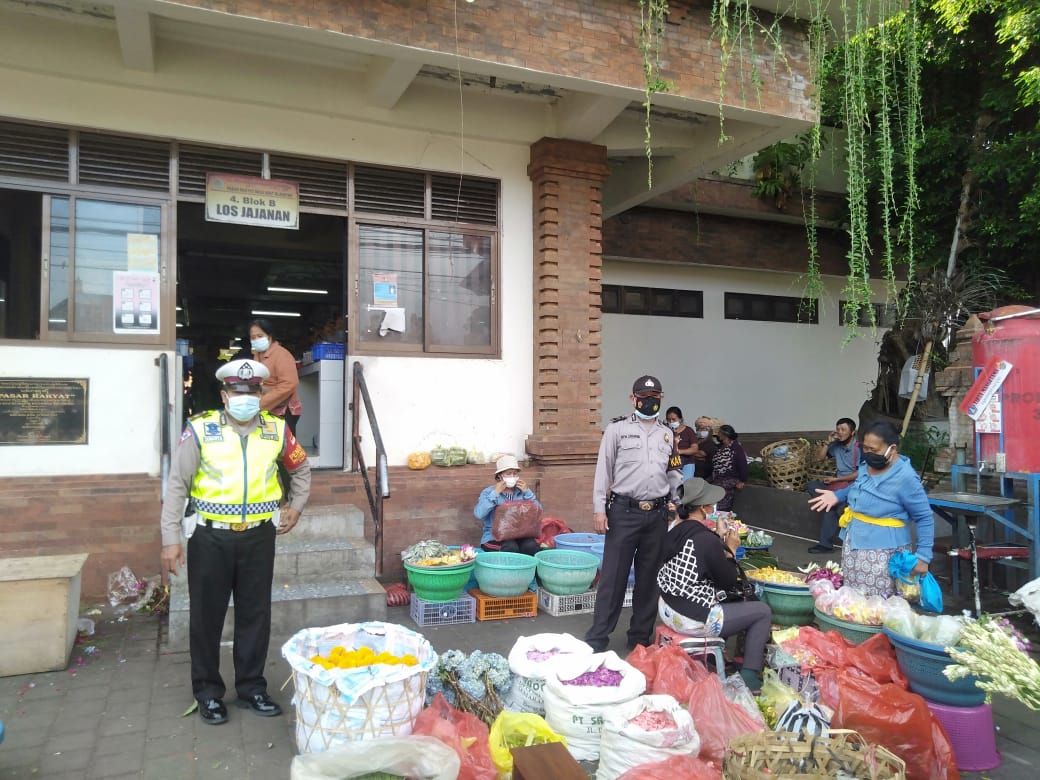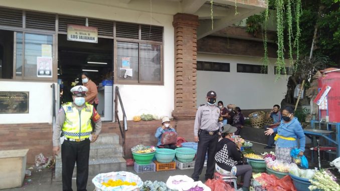 Polsek Abiansemal di Pimpin Panit 2 Samapta Ipda I Ketut Arsana bersama Instansi terkait melaksanakan pengawasan PPKM Level IV di pasar Blahkiuh Kecamatan Abiansemal, Sabtu (28/8) pagi.