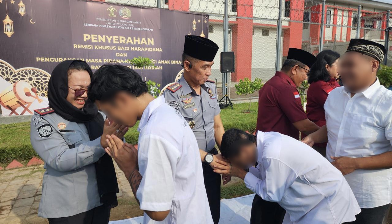 Kepala Kantor Wilayah Kementerian Hukum dan HAM Bali, berkesempatan menyerahkan Surat Keputusan (SK) Remisi Khusus Hari Raya Idul Fitri Tahun 2024 secara simbolis, kepada 2 orang perwakilan Narapidana Lapas Kelas IIA Kerobokan dan 2 orang perwakilan Narapidana Lapas Perempuan Kelas IIA Kerobokan, didampingi Kepala Divisi Pemasyarakatan (Kadivpas).